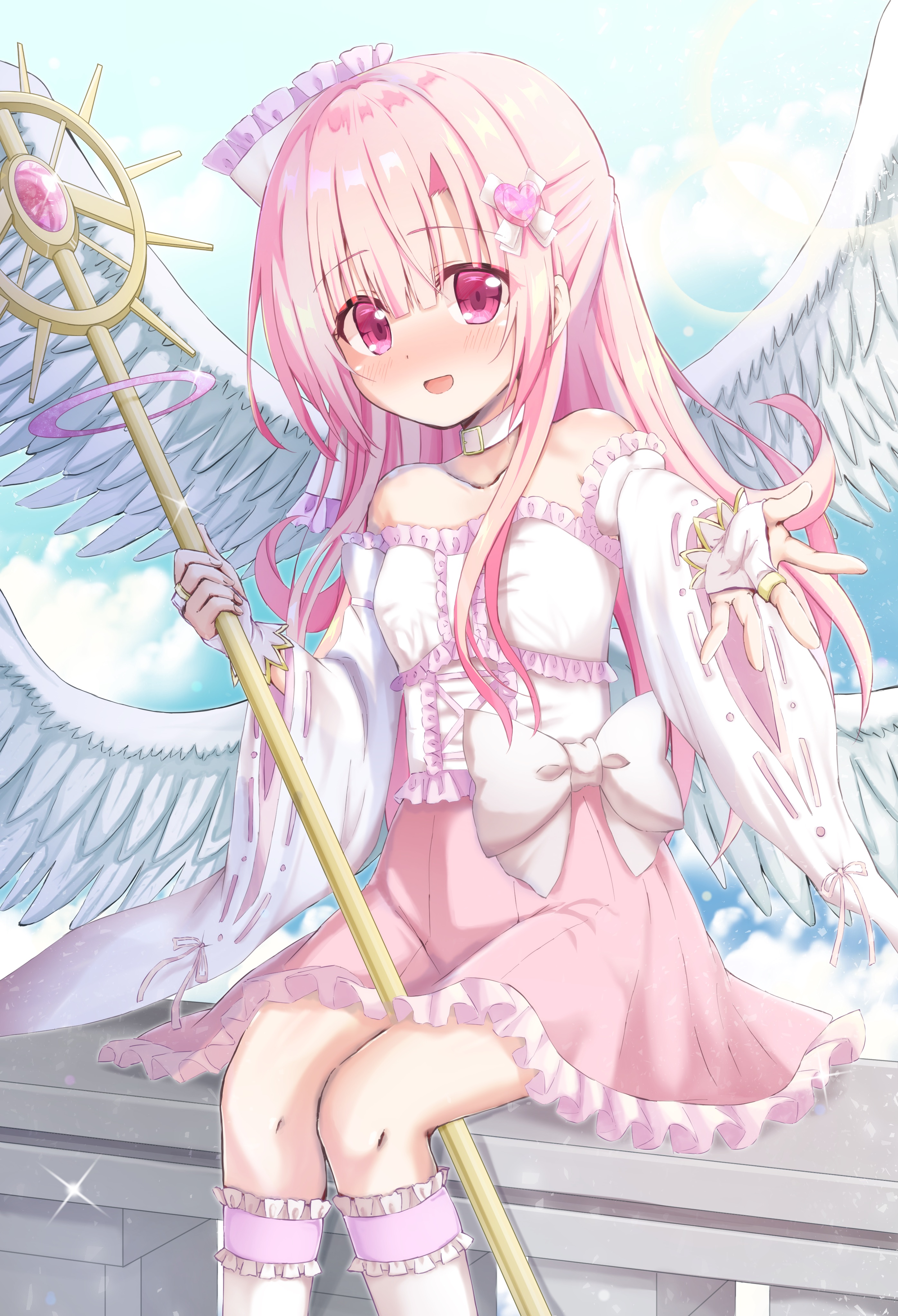 absurdres angel angel_wings artina_fialard_(yozakura_souki) blush bow bowtie dress fantasy fingerless_gloves frilled_dress frills gloves half_updo highres hime_cut long_hair one_side_up original pink_hair reaching red_eyes sitting sky smile staff white_bow white_bowtie wings yozakura_souki