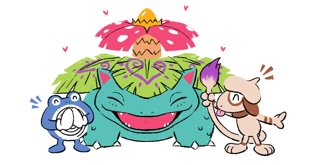 ^_^ animal_focus claws closed_eyes commission full_body gen_1_pokemon gen_2_pokemon gotchibam happy heart ko-fi_commission nintendo no_humans painting_(action) pokemon pokemon_(creature) poliwhirl sharp_teeth simple_background smeargle teeth tongue tongue_out venusaur white_background