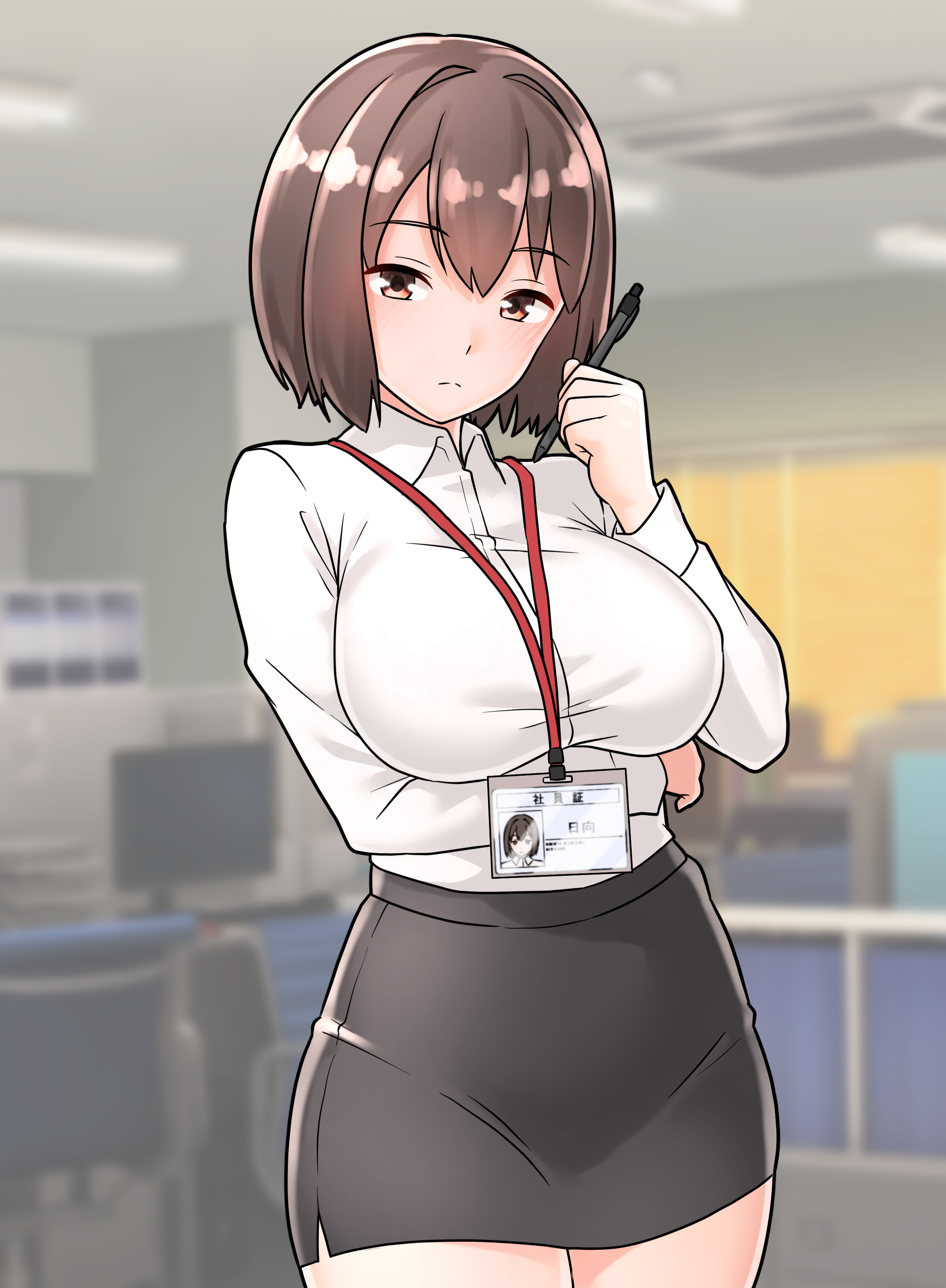 1girl absurdres alternate_costume arm_under_breasts blurry blurry_background blush breasts brown_eyes brown_hair closed_mouth collared_shirt commentary_request cowboy_shot furaggu_(frag_0416) hand_up highres holding holding_pen hyuuga_(kancolle) id_card indoors kantai_collection lanyard large_breasts light_frown long_sleeves looking_at_viewer office office_lady pen pencil pencil_skirt shirt short_hair signature skirt solo white_shirt