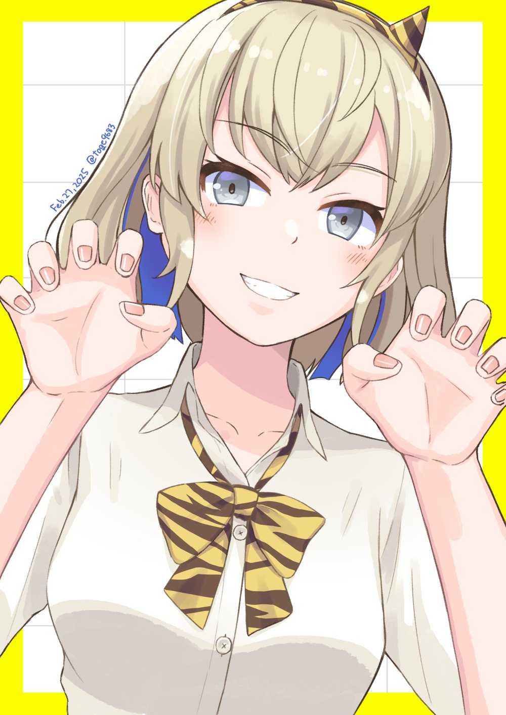 1girl animal_print armband blonde_hair blue_eyes blue_hair border club club_(weapon) collared_shirt commentary curled_fingers dated dress_shirt fake_horns gloire_(kancolle) gloire_kai_(kancolle) gloire_kai_(setsubun)_(kancolle) grin highres horns kantai_collection looking_at_viewer multicolored_hair outside_border school_uniform shirt short_hair smile solo spiked_club tiger_print toge_nbo twitter_username two-tone_background weapon white_background white_shirt yellow_armband yellow_border