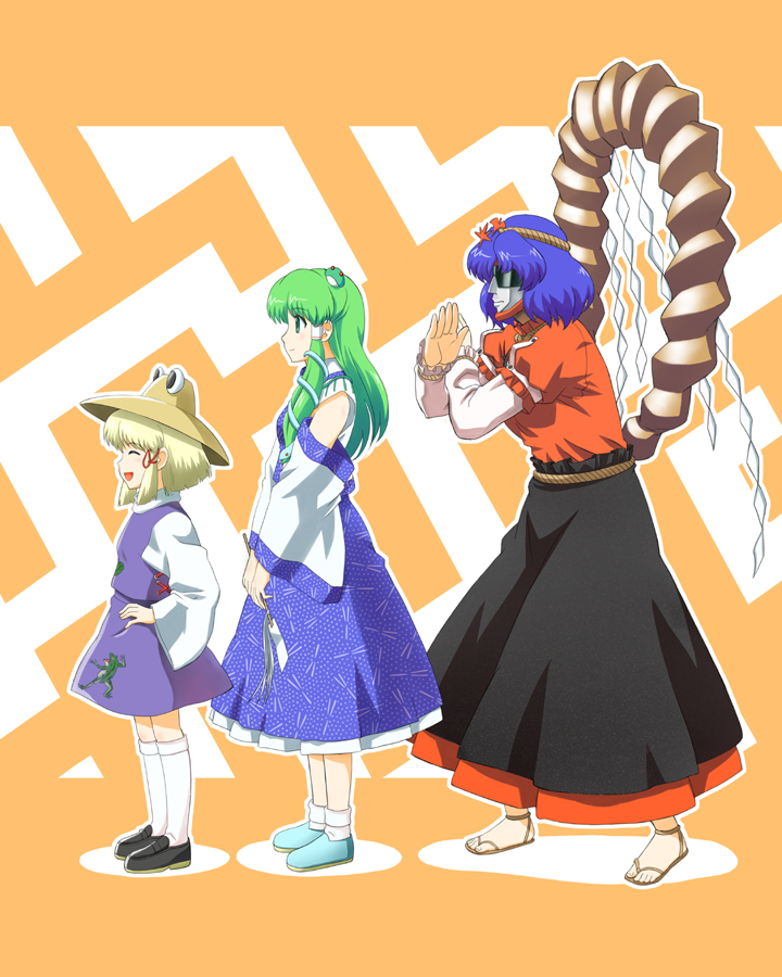 3girls animal_print aqua_shoes bare_shoulders black_shoes black_skirt blonde_hair blue_skirt breasts brown_hat collared_shirt detached_sleeves frilled_skirt frills frog_hair_ornament frog_print from_side go!_godman godman gohei green_eyes green_hair hair_ornament hair_ribbon hair_tubes hat holding holding_gohei ike!_godman jewelry kaijin kneehighs kochiya_sanae leaf_hair_ornament loafers long_hair long_skirt long_sleeves medium_breasts moriya_suwako multiple_girls necklace parody patterned_clothing print_skirt purple_skirt purple_vest red_shirt ribbon rope sandals satsuki_harunobu seijin shide shimenawa shirt shoes single_hair_tube single_sidelock skirt skirt_set sleeveless sleeveless_shirt snake_hair_ornament socks toho touhou two-tone_background vest white_shirt white_sleeves white_socks wide_sleeves yasaka_kanako