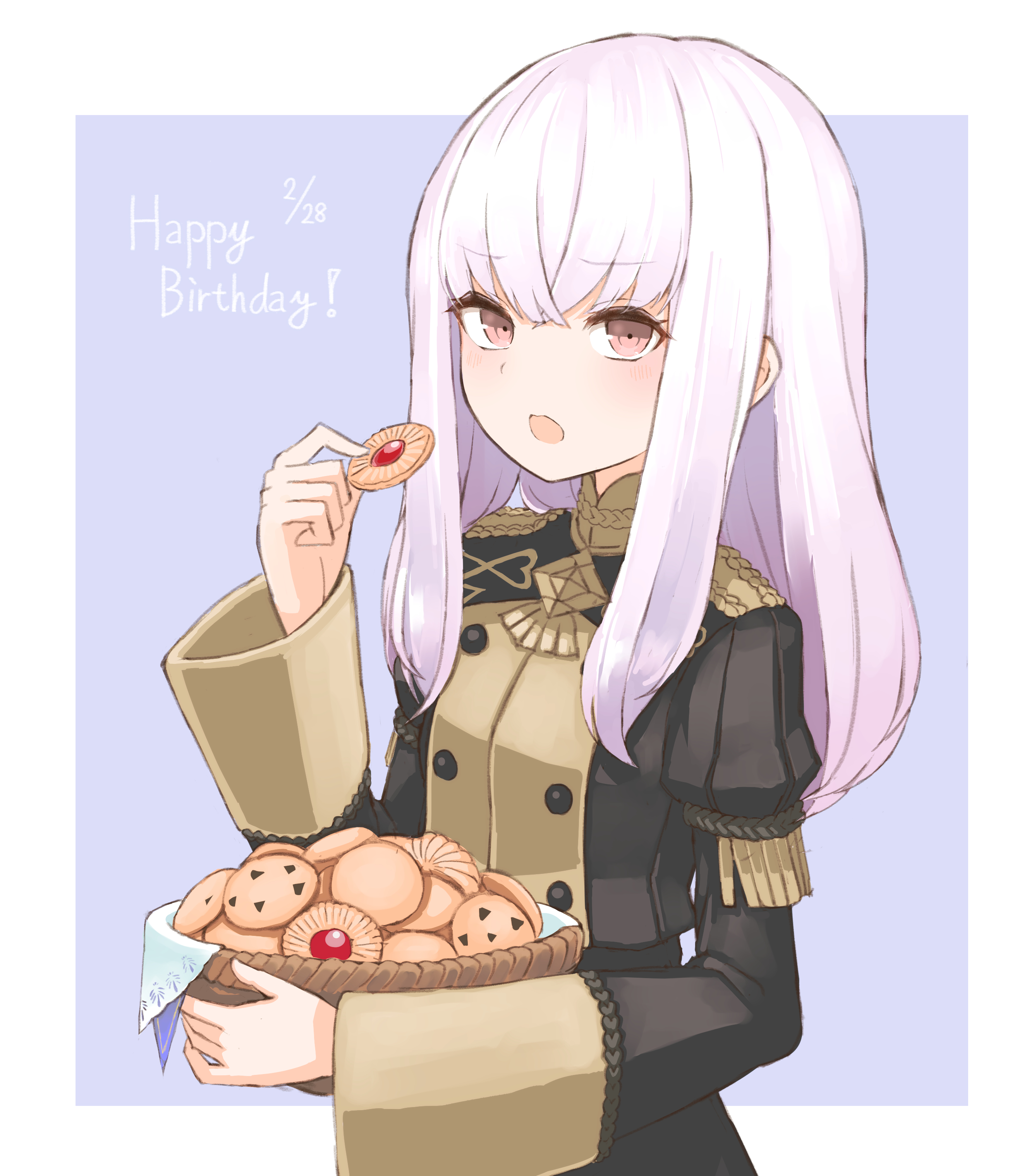 1girl absurdres basket border commentary_request cookie dated epaulettes fire_emblem fire_emblem:_three_houses food garreg_mach_monastery_uniform hand_up happy_birthday highres holding holding_basket holding_cookie holding_food long_sleeves looking_at_viewer lysithea_von_ordelia nintendo open_mouth outside_border pink_eyes sepia_(kilikasumi) sidelocks simple_background solo upper_body white_border white_hair