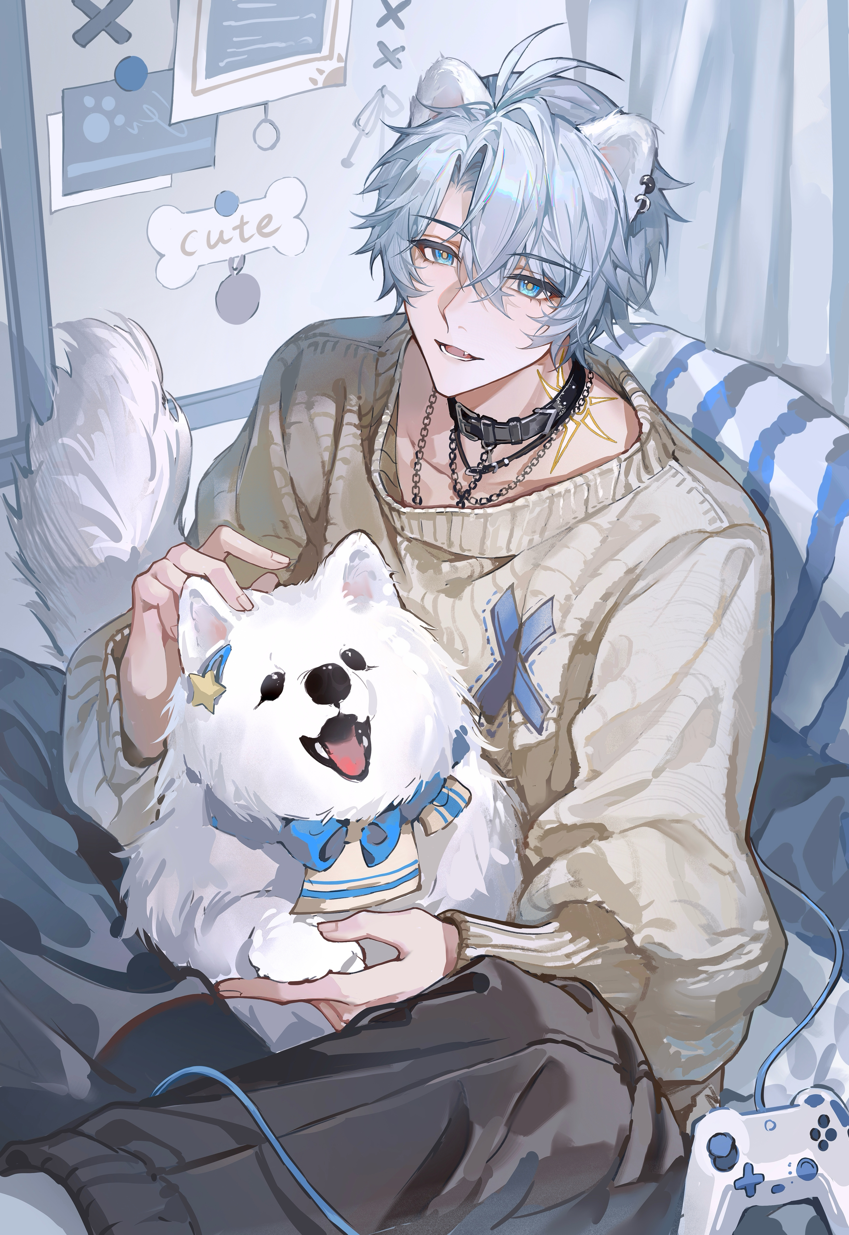 1boy absurdres animal animal_collar animal_ear_headwear animal_ear_piercing animal_ears antenna_hair black_collar black_pants blue_bow blue_eyes bow brown_sweater chain chain_necklace chinese_commentary collar collarbone commentary_request controller cross cross_print dog fake_animal_ears fang fluffy game_controller hair_between_eyes hair_ornament hairpin highres holding holding_animal holding_dog honkai:_star_rail honkai_(series) indoors jewelry long_sleeves looking_at_viewer male_focus necklace on_bed pants paw_print petting phainon_(honkai:_star_rail) pillow short_hair sitting socks solo sun_symbol sun_tattoo sweater tan tattoo white_hair white_socks yin01582942
