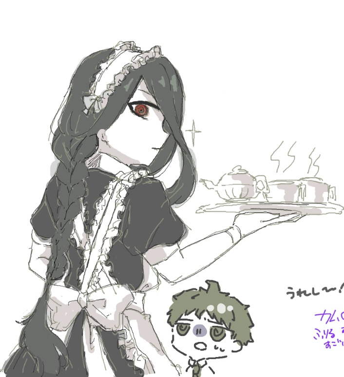 2boys :o ahoge alternate_costume black_hair braid brown_eyes brown_hair closed_mouth danganronpa_(series) danganronpa_2:_goodbye_despair enmaided haruyu_tugu hinata_hajime holding holding_tray kamukura_izuru long_hair looking_at_another maid multiple_boys pale_skin profile red_eyes short_hair simple_background sparkle sweat translation_request tray