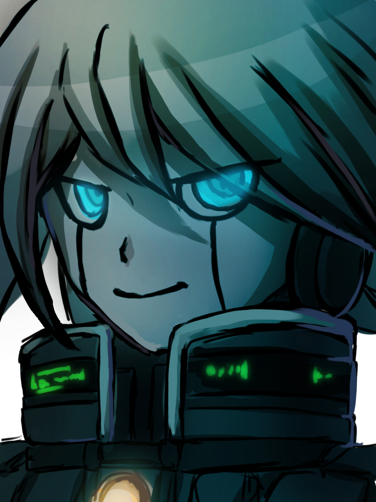 1boy android closed_mouth danganronpa_(series) danganronpa_v3:_killing_harmony glowing glowing_eyes green_eyes grey_background hair_between_eyes haruyu_tugu k1-b0 looking_at_viewer male_focus smile solo