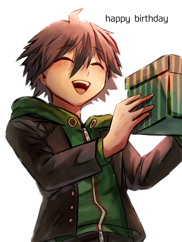 1boy :d ahoge black_jacket box brown_hair cowboy_shot danganronpa:_trigger_happy_havoc danganronpa_(series) gift gift_box green_hoodie happy_birthday haruyu_tugu holding holding_box hood hood_down hoodie jacket male_focus naegi_makoto open_clothes open_jacket open_mouth short_hair simple_background smile solo teeth upper_teeth_only white_background