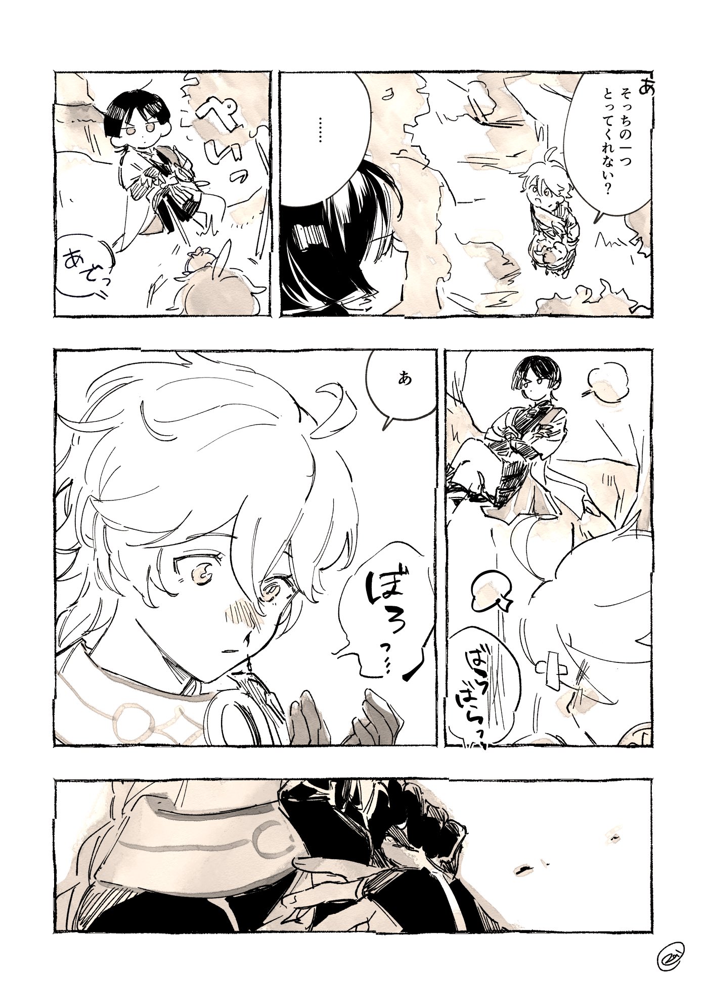 2boys aether_(genshin_impact) ahoge blood chibi genshin_impact highres male_focus monochrome multiple_boys missing_headwear nosebleed on_branch outdoors partially_translated puff_of_air reimi0792 scaramouche_(genshin_impact) signature sitting_on_branch speech_bubble translation_request wanderer_(genshin_impact)