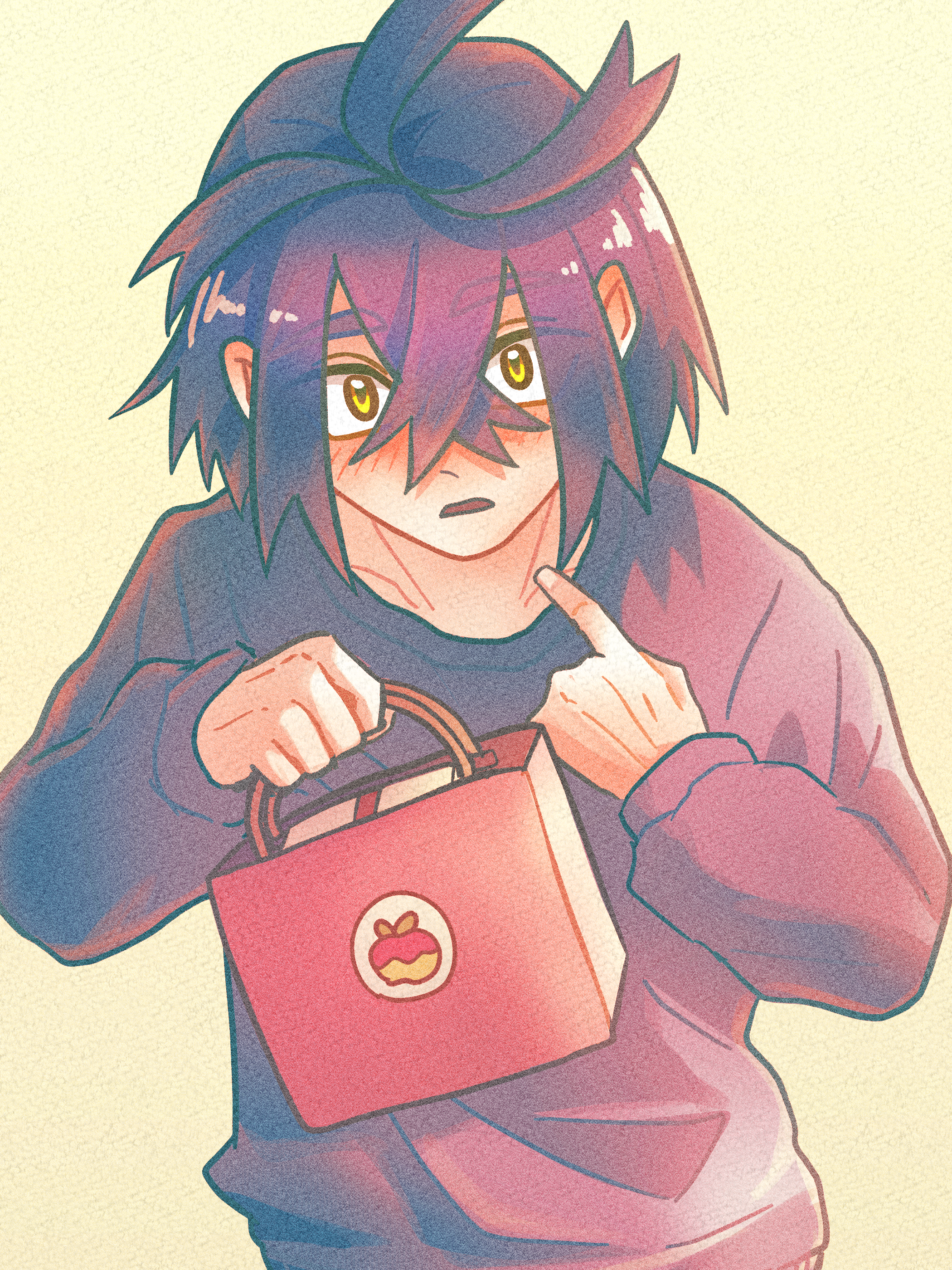 1boy absurdres alternate_costume bag black_hair blush commentary_request crossed_bangs hair_between_eyes hands_up highres holding holding_bag index_finger_raised kawamizuyade kieran_(pokemon) long_sleeves male_focus nintendo open_mouth pokemon pokemon_scarlet_and_violet solo sweater upper_body yellow_eyes