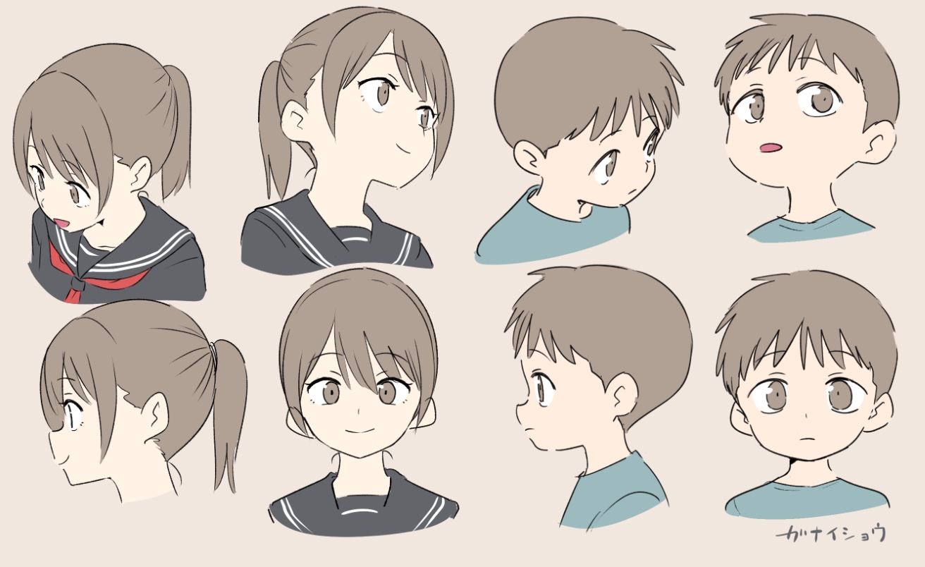 1boy 1girl aqua_shirt black_sailor_collar black_serafuku brown_eyes brown_hair closed_mouth flat_color ganaishoten grey_background neckerchief open_mouth original ponytail portrait profile red_neckerchief reference_sheet sailor_collar school_uniform serafuku shirt simple_background smile