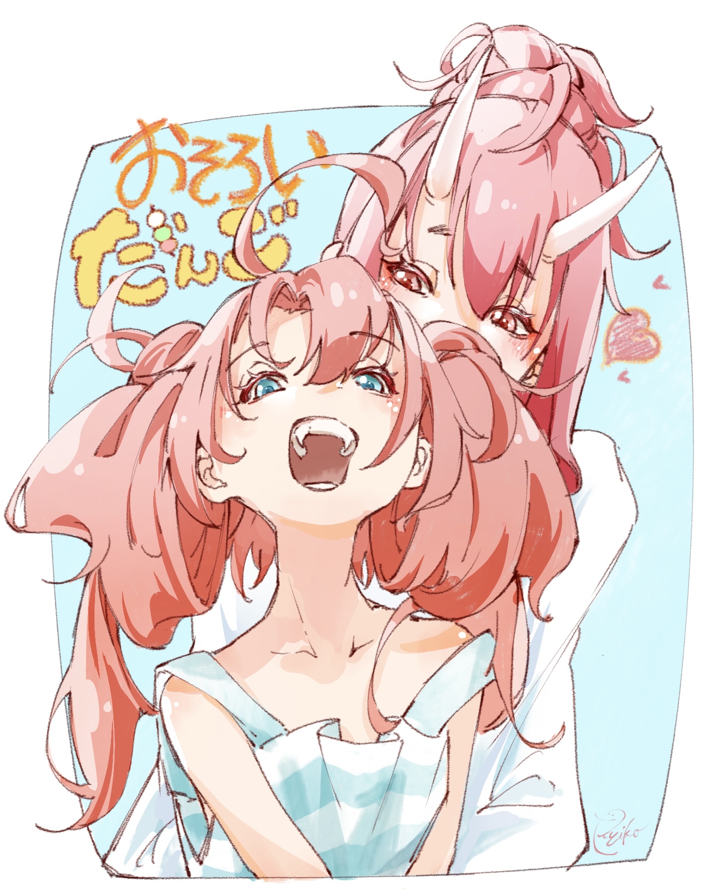 2girls blue_eyes casual dango demon_horns food heart highres horns long_hair milim_nava multiple_girls open_mouth poyuiko_oekk red_eyes shuna_(tensura) teeth tensei_shitara_slime_datta_ken translation_request wagashi white_background