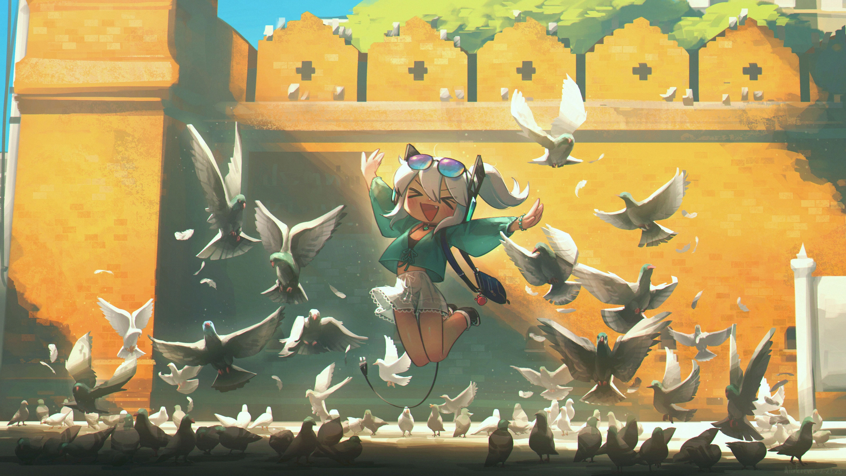 >_< 1girl :d absurdres aqua_shirt bag bead_bracelet beads bird bracelet commentary day digitan_(porforever) english_commentary eyewear_on_head fang hair_between_eyes highres jewelry jumping long_hair long_sleeves open_mouth original outdoors outstretched_arms pigeon ponytail porforever robot_ears see-through_clothes see-through_skirt shirt shoulder_bag skirt smile solo spread_arms stone_wall sunglasses thigh_gap white_hair white_skirt xd