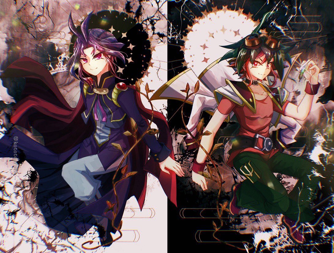 2boys coat collarbone goggles goggles_on_head green_hair jacket jacket_on_shoulders jewelry joeri_(yu-gi-oh!) kototourara male_focus medium_hair multicolored_hair multiple_boys orange_shirt pendant purple_coat purple_eyes purple_hair purple_jacket red_eyes red_hair sakaki_yuya shirt two-tone_hair white_jacket yu-gi-oh! yu-gi-oh!_arc-v