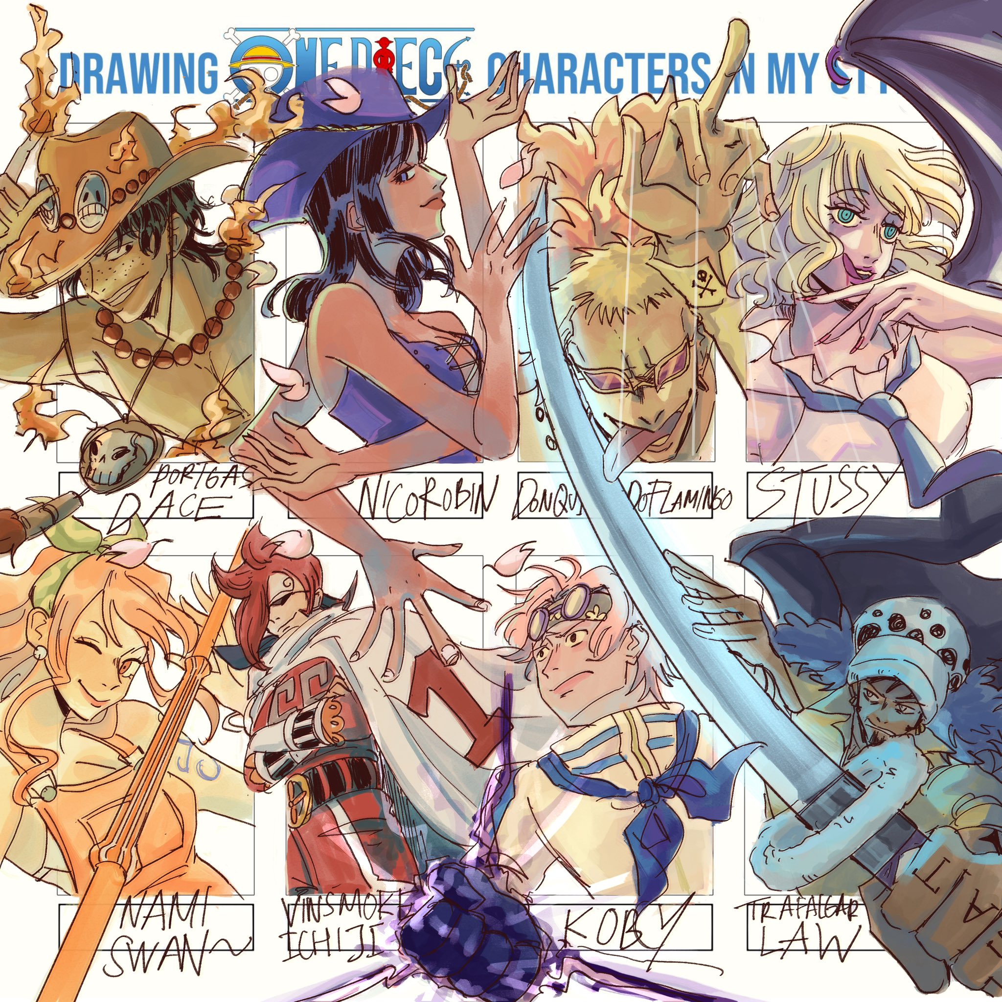 3girls 5boys arm_tattoo avaxxah black_hair black_wings blonde_hair blue_eyes blue_neckerchief blue_necktie cape character_name clenched_hand commentary copyright_name cowboy_hat crossed_arms curly_eyebrows donquixote_doflamingo earrings english_commentary extra_arms eyewear_on_head fire freckles haki_(one_piece) hana_hana_no_mi hand_tattoo hat headband highres holding holding_staff holding_sword holding_weapon jewelry koby_(one_piece) long_hair medium_hair multiple_boys multiple_drawing_challenge multiple_girls nami_(one_piece) neckerchief necklace necktie nico_robin nico_robin_(whisky_peak) one_eye_closed one_piece one_piece:_stampede orange_hair petals pink_hair pink_petals portgas_d._ace purple_hat purple_shirt red_hair shirt short_hair sleeveless smile staff string stussy_(one_piece) sunglasses sword tattoo tongue tongue_out topless_male trafalgar_law vinsmoke_ichiji weapon white_cape wings