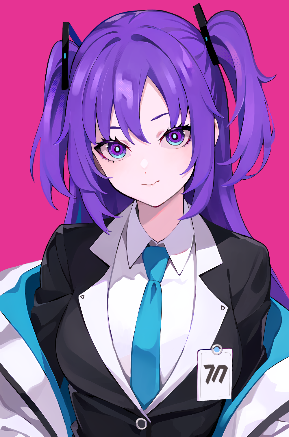 1girl blue_archive blue_eyes breasts halo highres jacket long_hair long_sleeves looking_at_viewer mechanical_halo necktie purple_eyes purple_hair shirt simple_background solo tor_(torkrub111) two_side_up white_shirt yuuka_(blue_archive)