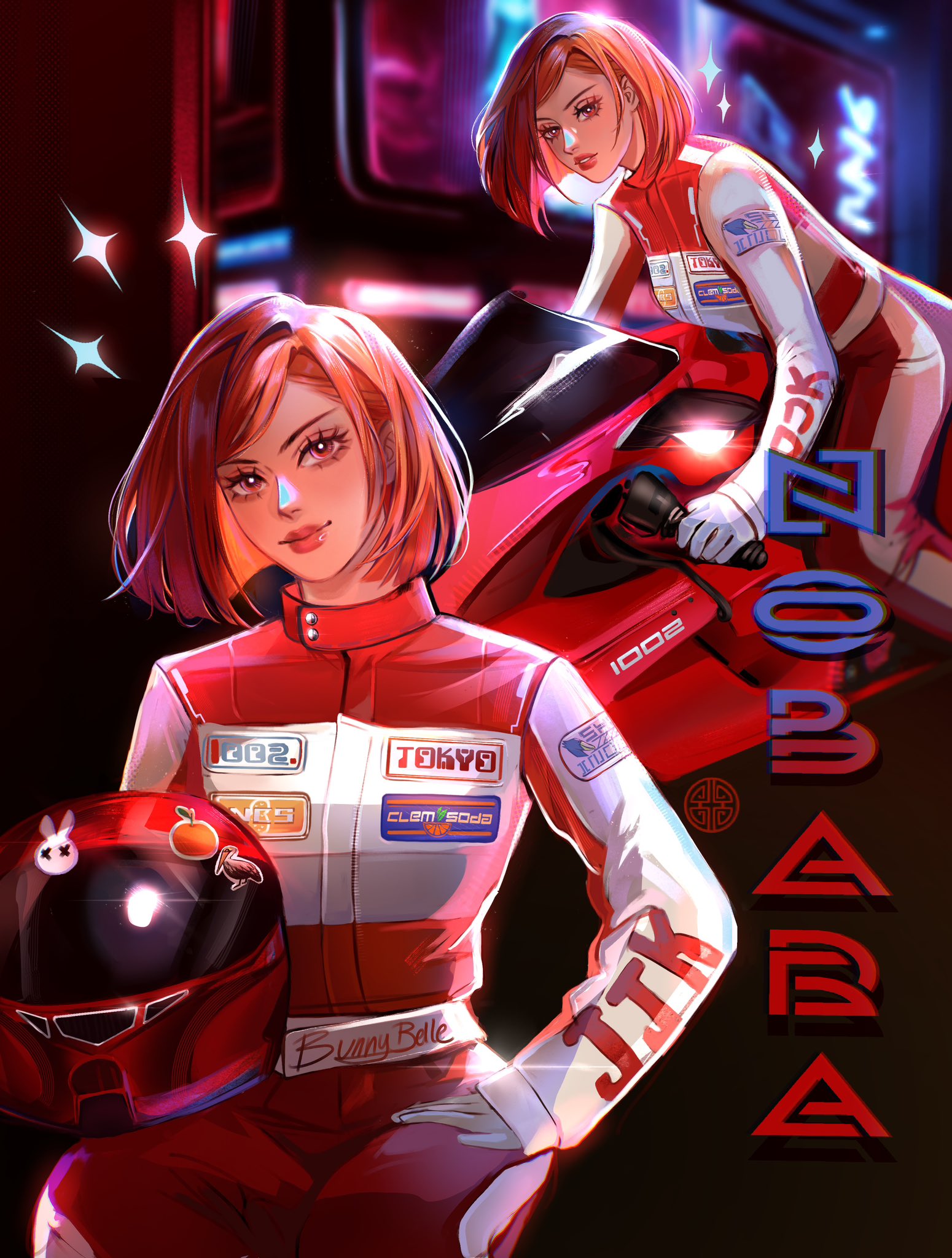 1girl bob_cut bodysuit bunnybelle22 character_name commentary english_commentary eyelashes gloves helmet highres holding holding_unworn_helmet jujutsu_kaisen kugisaki_nobara looking_at_viewer multiple_views orange_hair smile solo sparkle swept_bangs unworn_helmet white_gloves