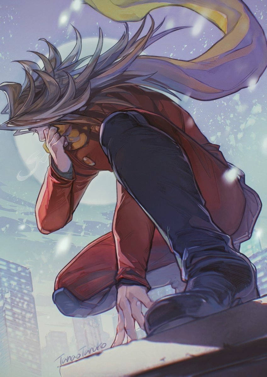 1boy black_boots boots buttons coat cyborg cyborg_009 dynamic_pose full_body hair_over_one_eye happy_birthday jet_link long_hair looking_at_viewer looking_down male_focus military_uniform orange_hair red_coat scarf spiked_hair tanaotanako yellow_scarf
