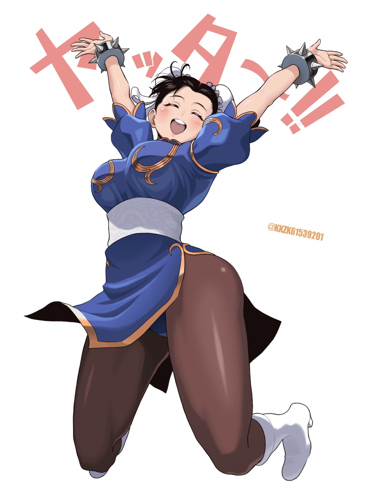 1girl arms_up artist_name black_hair boots breasts capcom chinese_clothes chun-li closed_eyes double_bun hair_bun happy highres japanese_text jumping kkzk61539201 large_breasts legs open_mouth pantyhose pink_lips solo street_fighter teeth thighs tongue translated victory_pose