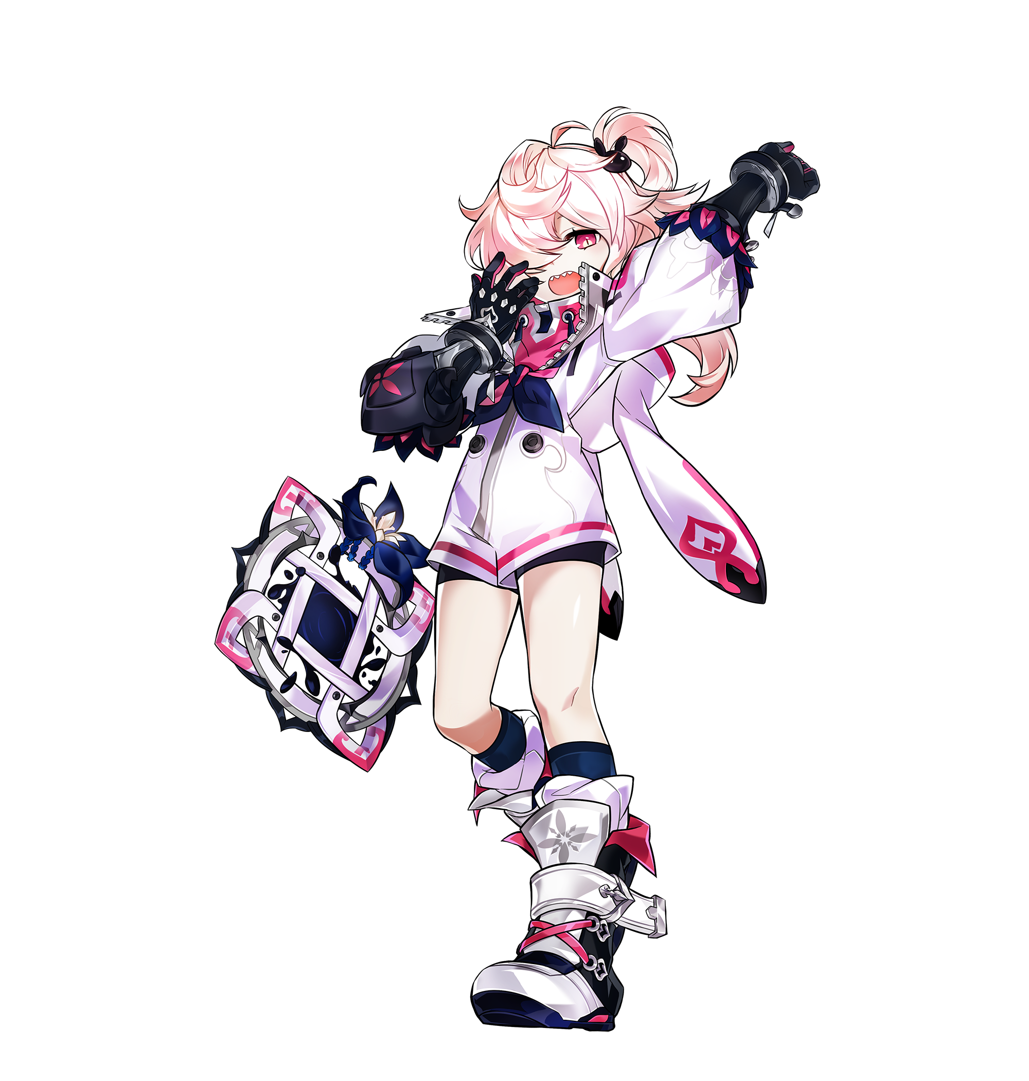 1girl animal_ear_hood animal_ears arm_up artist_request black_boots black_gloves black_shorts black_socks blue_bow blue_bowtie blue_flower boots bow bowtie bracelet bright_pupils elsword eyelashes fake_animal_ears floral_print flower full_body gloves hair_ornament hair_over_one_eye highres hood hood_down hooded_jacket jacket jewelry kneehighs knees laby_(elsword) lace-up_boots long_hair long_sleeves looking_at_viewer loose_hair_strand mirror multicolored_boots nisha_(elsword) official_art one_side_up open_mouth partially_unzipped pink_eyes pink_hair pink_shirt puffy_long_sleeves puffy_sleeves rabbit_ears rabbit_hair_ornament second-party_source sharp_teeth shirt short_shorts shorts sleepy socks solo studded_gloves tachi-e teeth transparent_background turtleneck turtleneck_shirt two-tone_boots upper_teeth_only white_boots white_jacket white_pupils yawning zipper