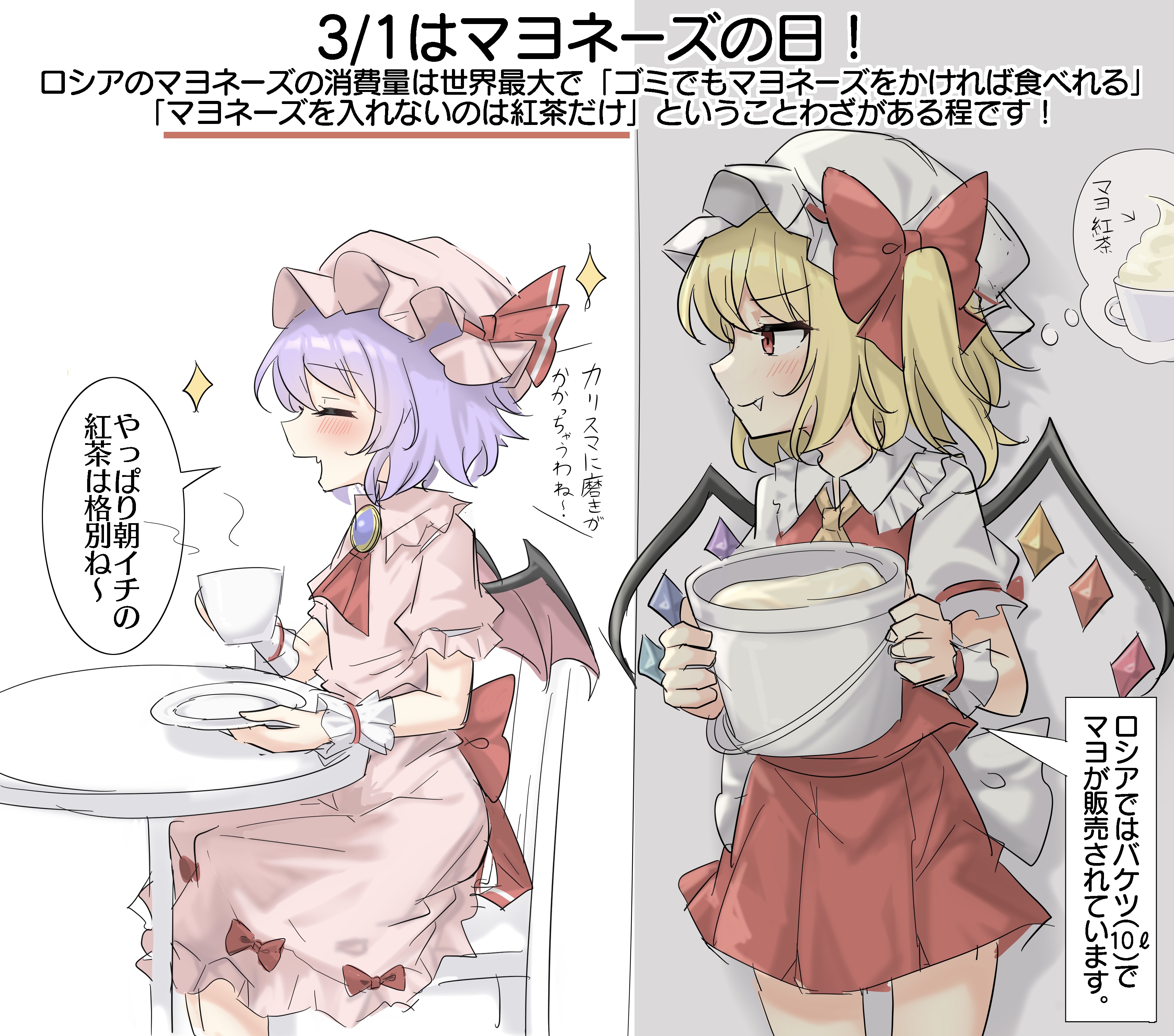 2girls absurdres ascot bat_wings blonde_hair blush bow brooch bucket chair closed_eyes closed_mouth collared_shirt commentary_request crystal crystal_wings cup fang fang_out flandre_scarlet frilled_shirt_collar frills hat hat_bow highres holding holding_bucket holding_cup holding_plate impending_doom jewelry mayonnaise mob_cap multicolored_wings multiple_girls on_chair one_side_up open_mouth pink_hat pink_shirt pink_skirt plate purple_hair red_ascot red_bow red_eyes red_skirt red_vest remilia_scarlet shirt short_sleeves siblings side_ponytail sisters sitting skirt skirt_set smile speech_bubble table touhou translation_request vest white_hat white_shirt wings wrist_cuffs yellow_ascot youyume-kun
