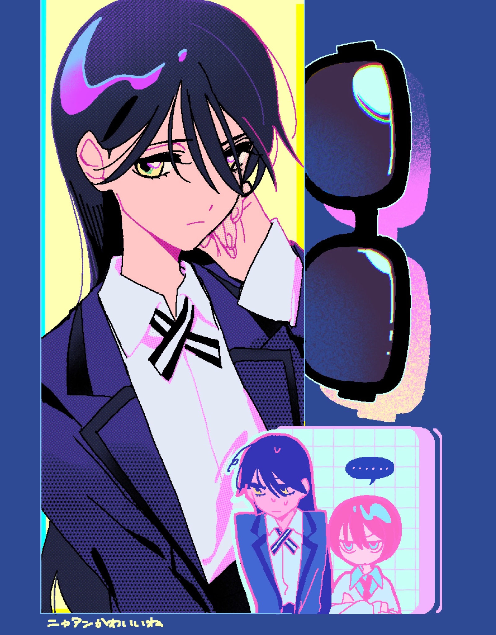 ... 2girls amate_yuzuriha aqua_shirt averting_eyes black_hair black_necktie blue_jacket bolo_tie closed_mouth collared_shirt commentary crossed_arms frown gundam gundam_gquuuuuux hand_up highres jacket kirokuyyyy lapels long_hair long_sleeves looking_at_viewer multiple_girls multiple_views necktie notched_lapels nyaan_(gundam_gquuuuuux) open_clothes open_jacket pink_hair school_uniform shirt short_hair speech_bubble spoken_ellipsis striped_clothes striped_necktie sunglasses sweat sweater translation_request white_shirt white_sweater wing_collar yellow_eyes