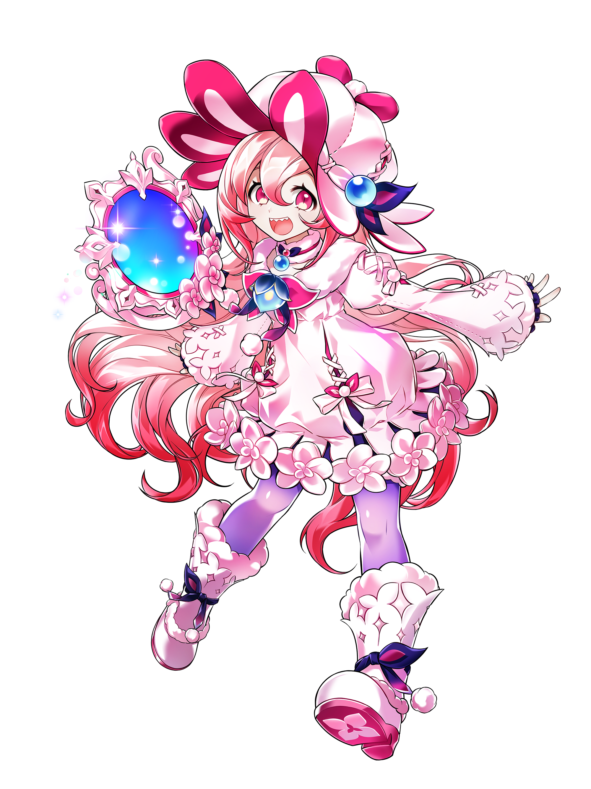 1girl absurdres artist_request black_bow black_bowtie blue_flower boots bow bow_choker bowtie brooch choker cross-laced_clothes cross-laced_dress dress dress_bow dress_flower elsword eyelashes floating floating_object flower flower_brooch footwear_bow frilled_sleeves frills full_body fur-trimmed_boots fur-trimmed_dress fur_choker fur_trim gradient_hair hair_between_eyes happy hat hat_bow highres knee_boots knees laby_(elsword) large_hat long_hair long_sleeves medium_dress mirror mob_cap multicolored_hair nisha_(elsword) official_alternate_costume official_art open_mouth pantyhose pink_bow pink_eyes pink_hair pom_pom_(clothes) puffy_long_sleeves puffy_sleeves purple_pantyhose red_hair second-party_source sharp_teeth shining_romantica_(elsword) sleeves_past_wrists smile solo tachi-e tareme teeth transparent_background upper_teeth_only very_long_hair white_boots white_bow white_choker white_dress white_flower white_hat