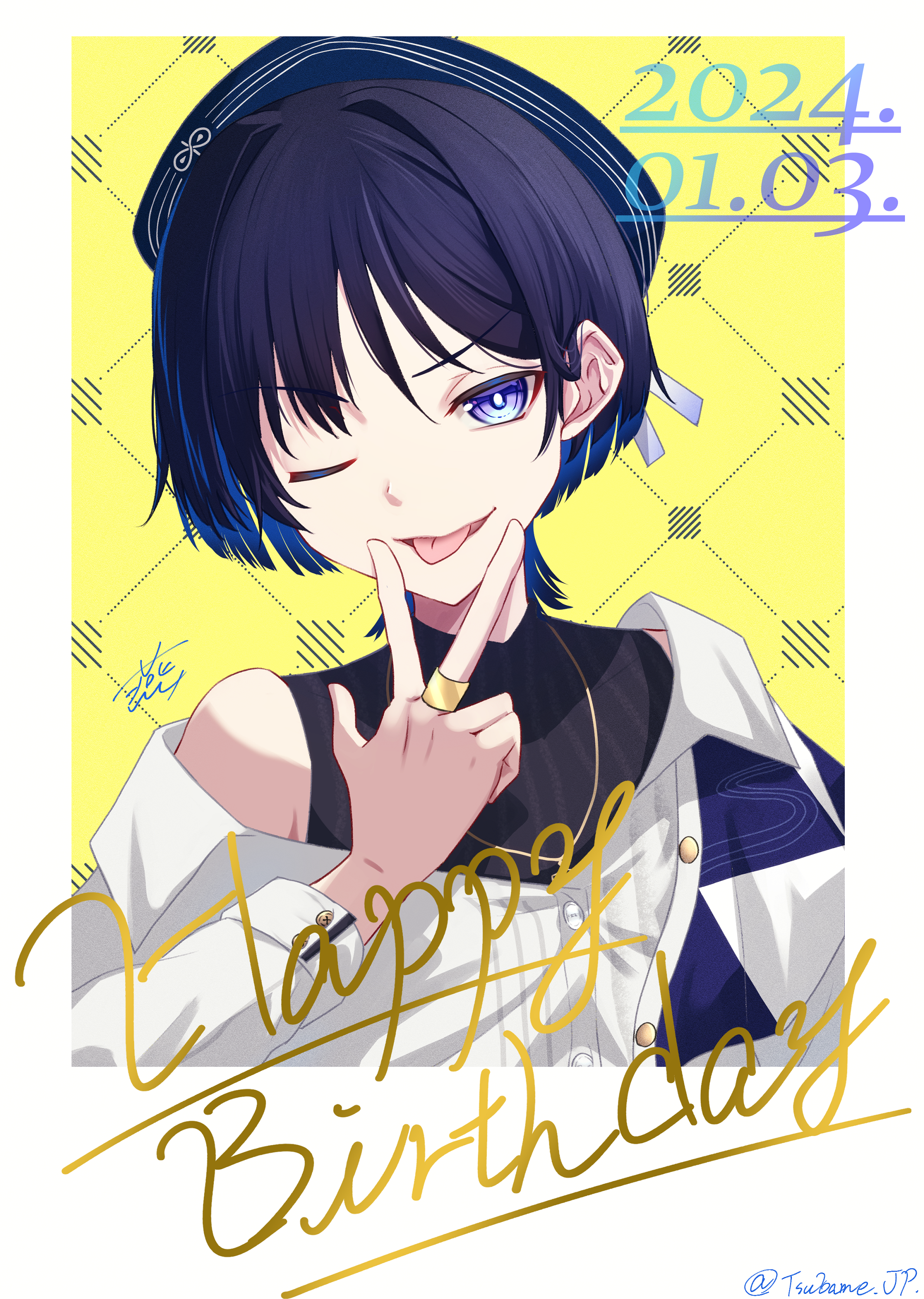 1boy absurdres black_hair black_shirt blue_hat blunt_ends border dated genshin_impact happy_birthday hat highres jewelry male_focus necklace one_eye_closed open_mouth purple_eyes scaramouche_(genshin_impact) shirt short_hair short_sleeves simple_background solo tongue tsubame-tsubame- v v_over_mouth wanderer_(genshin_impact) white_background white_border white_shirt yellow_background