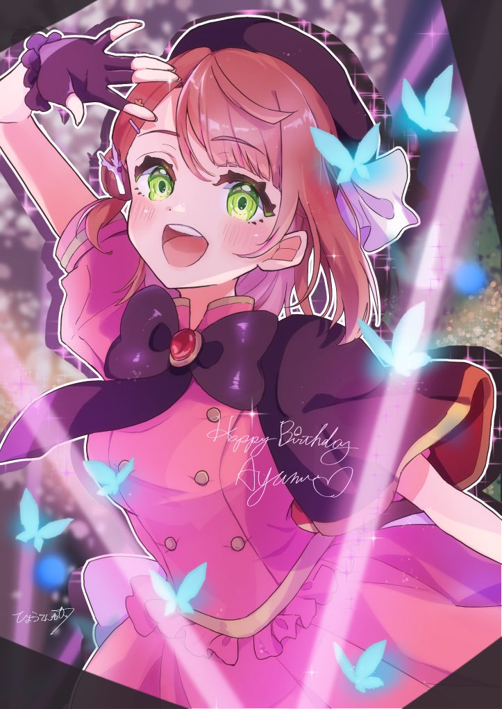 1girl :d arm_up beret black_bow black_bowtie black_capelet black_gloves black_hat black_necktie blue_butterfly blunt_bangs blurry blurry_background bow bowtie bug butterfly buttons capelet character_name commentary_request coral_hair_ornament desuwa07th double-breasted fingerless_gloves frilled_gloves frills gloves glowing_butterfly green_eyes hair_bun hair_ornament hairclip half_updo happy_birthday hat heart insect looking_at_viewer love_live! love_live!_nijigasaki_high_school_idol_club love_live!_nijigasaki_high_school_idol_club_the_movie_-_finale medium_hair necktie official_alternate_costume open_mouth pink_hair pink_shirt pink_skirt pleated_skirt shirt side_cape single_side_bun skirt skirt_set smile solo stellar_stream_(love_live!) swept_bangs uehara_ayumu
