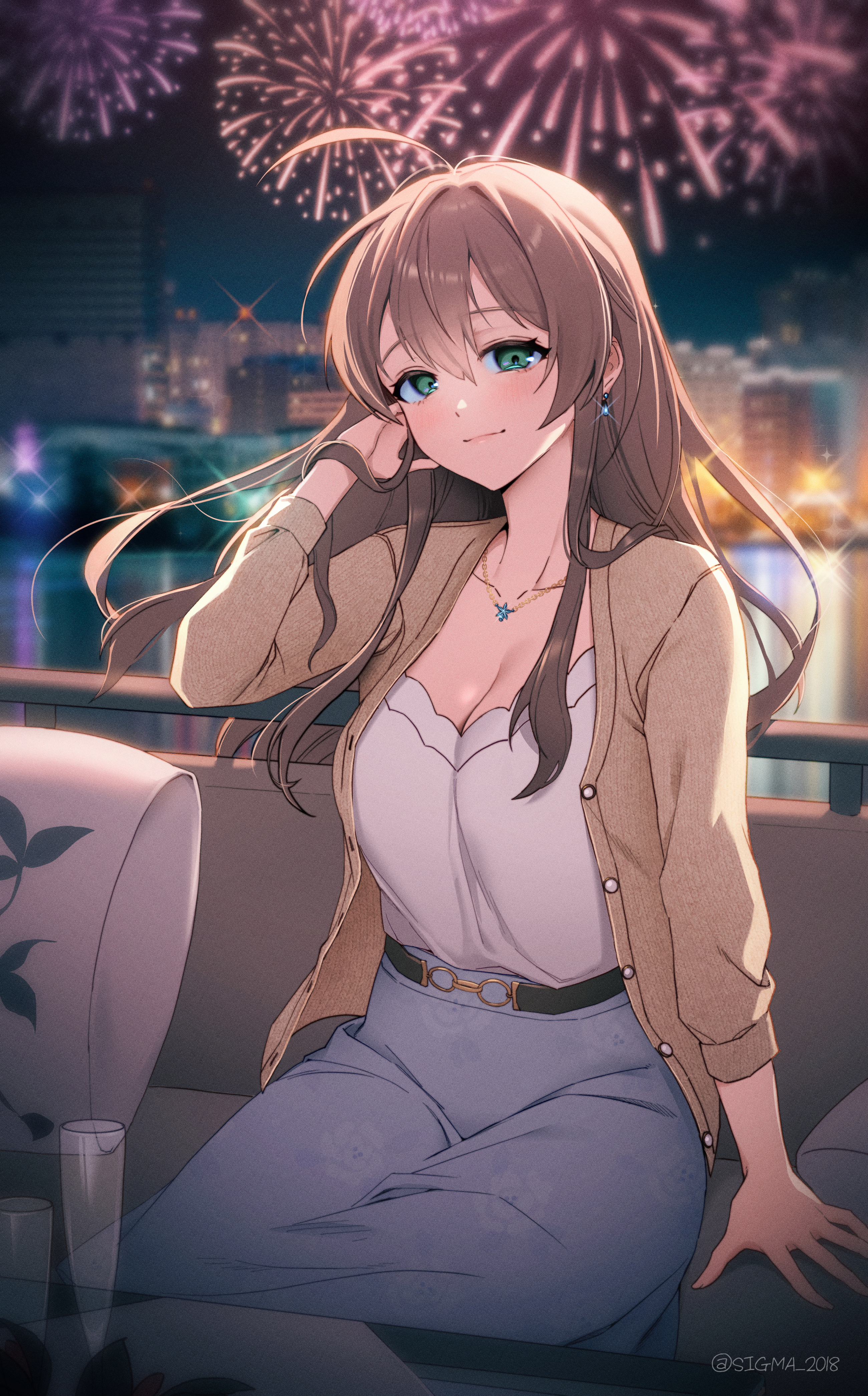 1girl absurdres arm_at_side balcony belt black_belt blue_shirt blurry blurry_background blush breasts brown_hair brown_jacket cityscape cleavage closed_mouth collarbone commentary_request couch cowboy_shot earrings fireworks green_eyes hand_in_own_hair highres idolmaster idolmaster_million_live! idolmaster_million_live!_theater_days jacket jewelry long_hair looking_at_viewer medium_breasts necklace on_couch open_clothes open_jacket outdoors private_dress_(idolmaster_million_live!) reflection reflective_liquid sakuramori_kaori shirt sigma_2018 sitting smile solo sparkle twitter_username white_shirt wind