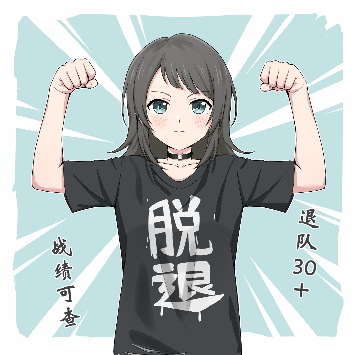 1girl anglediana bang_dream! bang_dream!_it's_mygo!!!!! black_choker black_hair black_shirt blue_eyes blush chinese_commentary chinese_text choker closed_mouth commentary_request flexing girls_band_cry highres medium_hair o-ring o-ring_choker revision shikai_no_sumi_kuchiru_oto shirt short_sleeves solo translation_request yahata_umiri