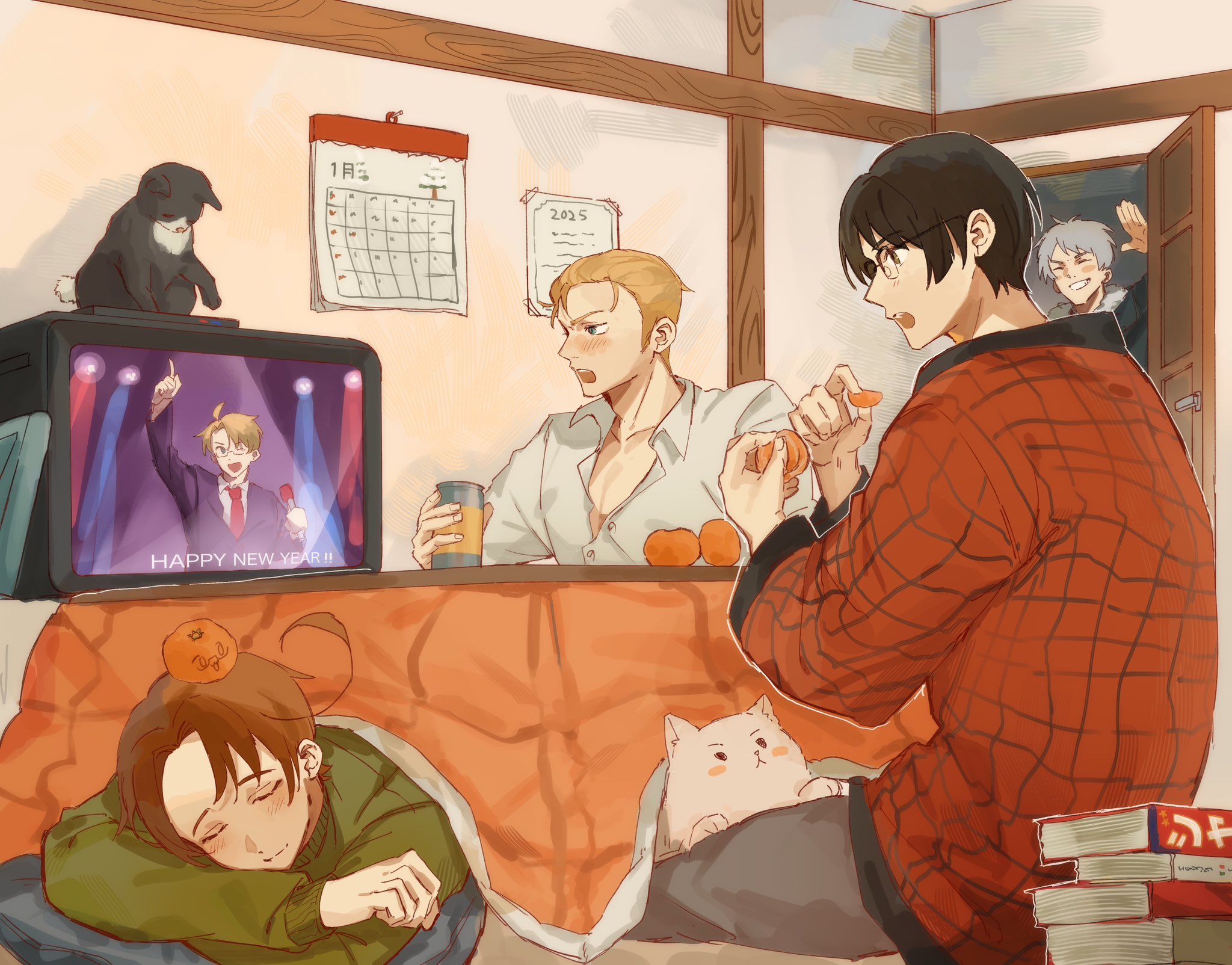 5boys ahoge america_(hetalia) animal_ears animal_nose arm_up axis_powers_hetalia black-framed_eyewear black_cat black_hair black_jacket blonde_hair blue_eyes blush book book_stack brothers brown_eyes brown_hair buttons calendar_(object) cat cat_ears cat_tail checkered_haori closed_eyes closed_mouth collarbone collared_shirt cup dog dog_ears english_text food fruit fur-trimmed_jacket fur_trim germany_(hetalia) glasses green_sweater grey_hair grey_pants hands_up haori happy_new_year highres hkym_kk holding holding_cup holding_food holding_fruit holding_microphone index_finger_raised indoors jacket japan_(hetalia) japanese_clothes lapels long_sleeves looking_at_object lying mandarin_orange microphone multiple_boys necktie new_year northern_italy_(hetalia) on_stomach one_eye_closed open_door open_mouth pants pet pillow prussia_(hetalia) puffy_long_sleeves puffy_sleeves red_necktie shirt short_hair siblings sitting smile stage_lights suit_jacket sweater table tail teeth television v-shaped_eyebrows watching_television white_dog wide_sleeves