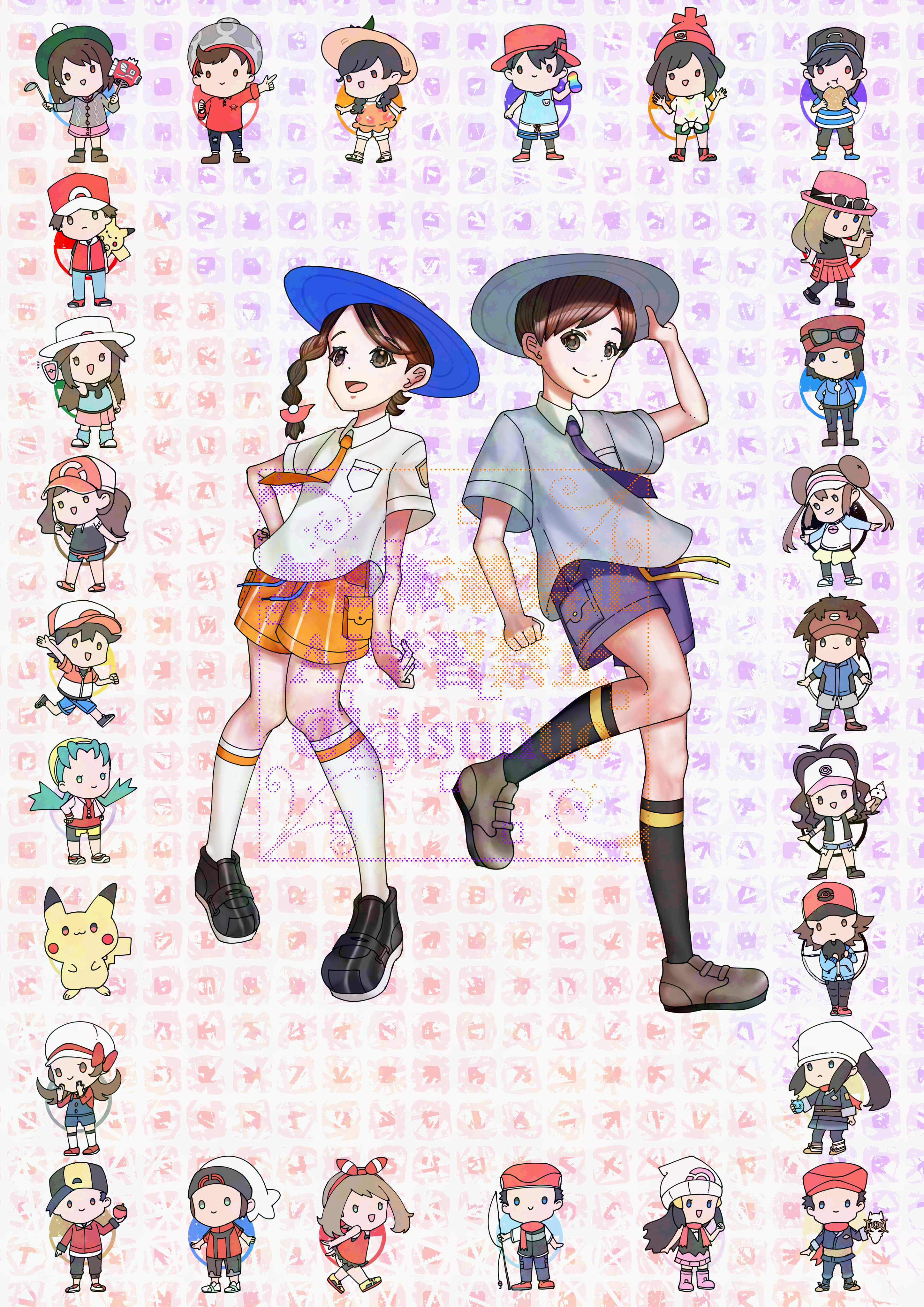 6+boys 6+girls absurdres akari_(pokemon) arceus baseball_cap beanie berry_(pokemon) black_hair black_shoes black_socks blue_eyes blue_hat boots bow braid brendan_(pokemon) brown_eyes brown_hair brown_shoes calem_(pokemon) chase_(pokemon) collared_shirt commentary_request dawn_(pokemon) elaine_(pokemon) elio_(pokemon) ethan_(pokemon) eyewear_on_headwear fishing_rod florian_(pokemon) gen_1_pokemon gen_4_pokemon gloria_(pokemon) green_eyes grey_hat grey_shirt hair_bun hand_on_headwear hand_on_own_hat hand_on_own_hip hand_up happy hat hat_bow headscarf highres hilbert_(pokemon) hilda_(pokemon) holding holding_fishing_rod holding_ladle juliana_(pokemon) kitsunuo kneehighs kris_(pokemon) ladle leaf_(pokemon) legendary_pokemon long_hair lucas_(pokemon) lyra_(pokemon) magikarp may_(pokemon) multiple_boys multiple_girls mythical_pokemon naranja_academy_school_uniform nate_(pokemon) necktie nintendo open_mouth orange_necktie orange_shorts pikachu pink_boots pokemon pokemon_(creature) pokemon_black_and_white pokemon_black_2_and_white_2 pokemon_diamond/pearl/platinum pokemon_firered_and_leafgreen pokemon_gold/silver/crystal pokemon_heartgold_and_soulsilver pokemon_legends:_arceus pokemon:_let's_go_pikachu!_and_let's_go_eevee! pokemon_omega_ruby_and_alpha_sapphire pokemon_sun_and_moon pokemon_scarlet_and_violet pokemon_sword_and_shield pokemon_ultra_sun_and_ultra_moon pokemon_x_and_y purple_necktie purple_shorts red_(pokemon) red_bow red_hat rei_(pokemon) rosa_(pokemon) scarf school_uniform selene_(pokemon) serena_(pokemon) shirt shoes short_hair short_sleeves shorts skirt smile socks sunglasses tam_o'_shanter twintails uva_academy_school_uniform victor_(pokemon) watermark white_headscarf white_shirt white_socks