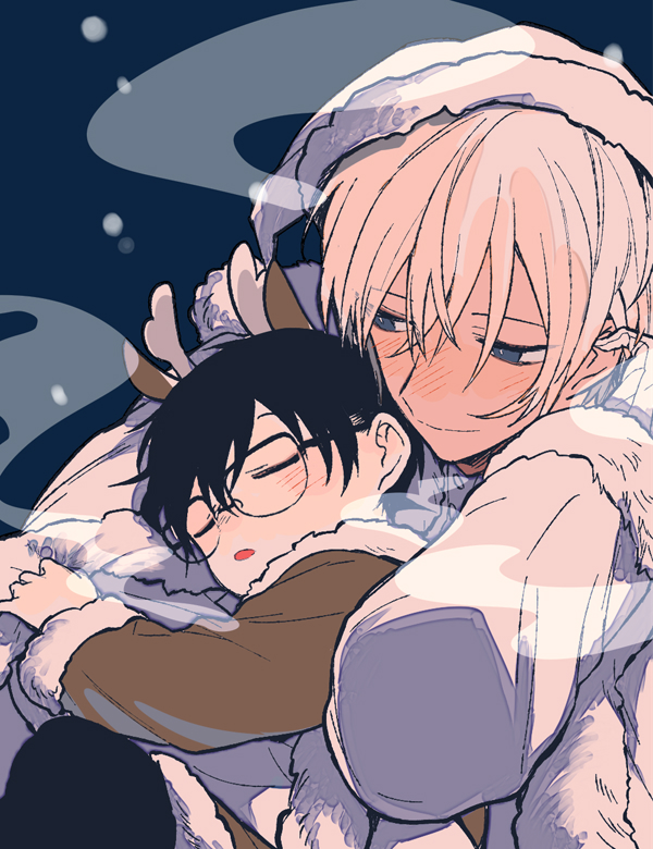 2boys akio_(89e) amuro_tooru animal_ears antlers black_hair black_pants blonde_hair blue_background blue_eyes blush brown_coat closed_eyes closed_mouth coat commentary_request crossed_bangs deer_ears edogawa_conan fur-trimmed_hood fur-trimmed_sleeves fur_trim glasses hair_between_eyes hood hood_up hooded_coat horns looking_at_another male_focus meitantei_conan multiple_boys open_mouth pants reindeer_antlers rimless_eyewear short_hair sleeping smile white_coat white_fur