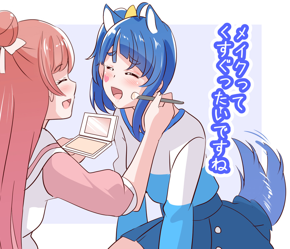 2girls ahoge animal_ears applying_makeup blue_hair blue_skirt blush bow closed_eyes dress hair_bow hair_bun hair_ribbon hirogaru_sky!_precure holding long_hair long_sleeves makeup_brush medium_hair mitumi_mira multiple_girls nijigaoka_mashiro open_mouth pink_hair precure ribbon shirt side_ponytail single_hair_bun single_sidelock skirt smile sora_harewataru t-shirt tail translation_request two-tone_dress two-tone_shirt white_ribbon wolf_ears wolf_tail yellow_bow