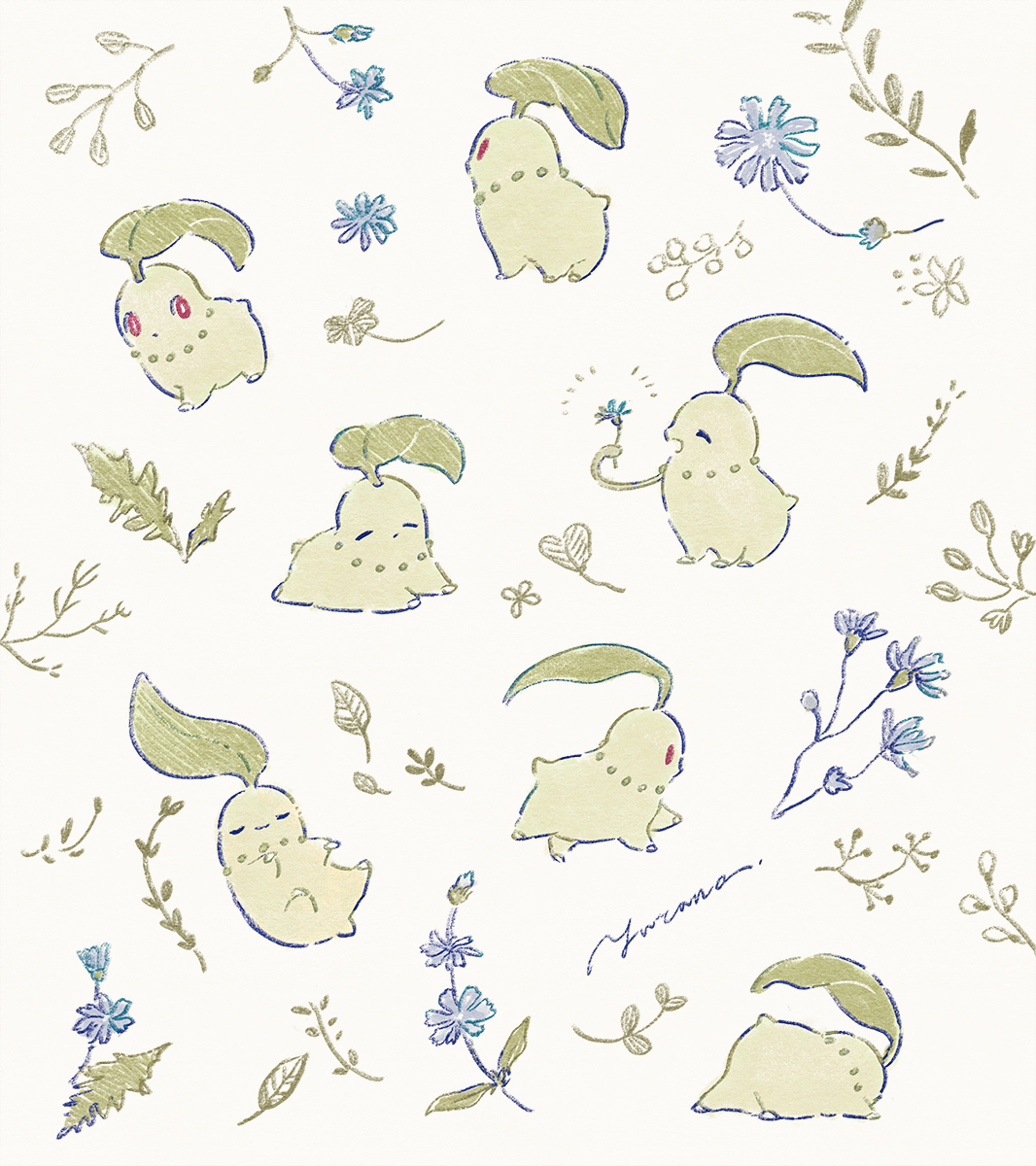 blue_flower branch chicory_(flower) chikorita closed_eyes closed_mouth commentary_request flower full_body gen_2_pokemon grey_background highres holding holding_flower leaf leaf_on_head lying multiple_views nintendo no_humans on_back on_stomach open_mouth plant pokemon pokemon_(creature) red_eyes signature simple_background vines walking yurano_(upao)