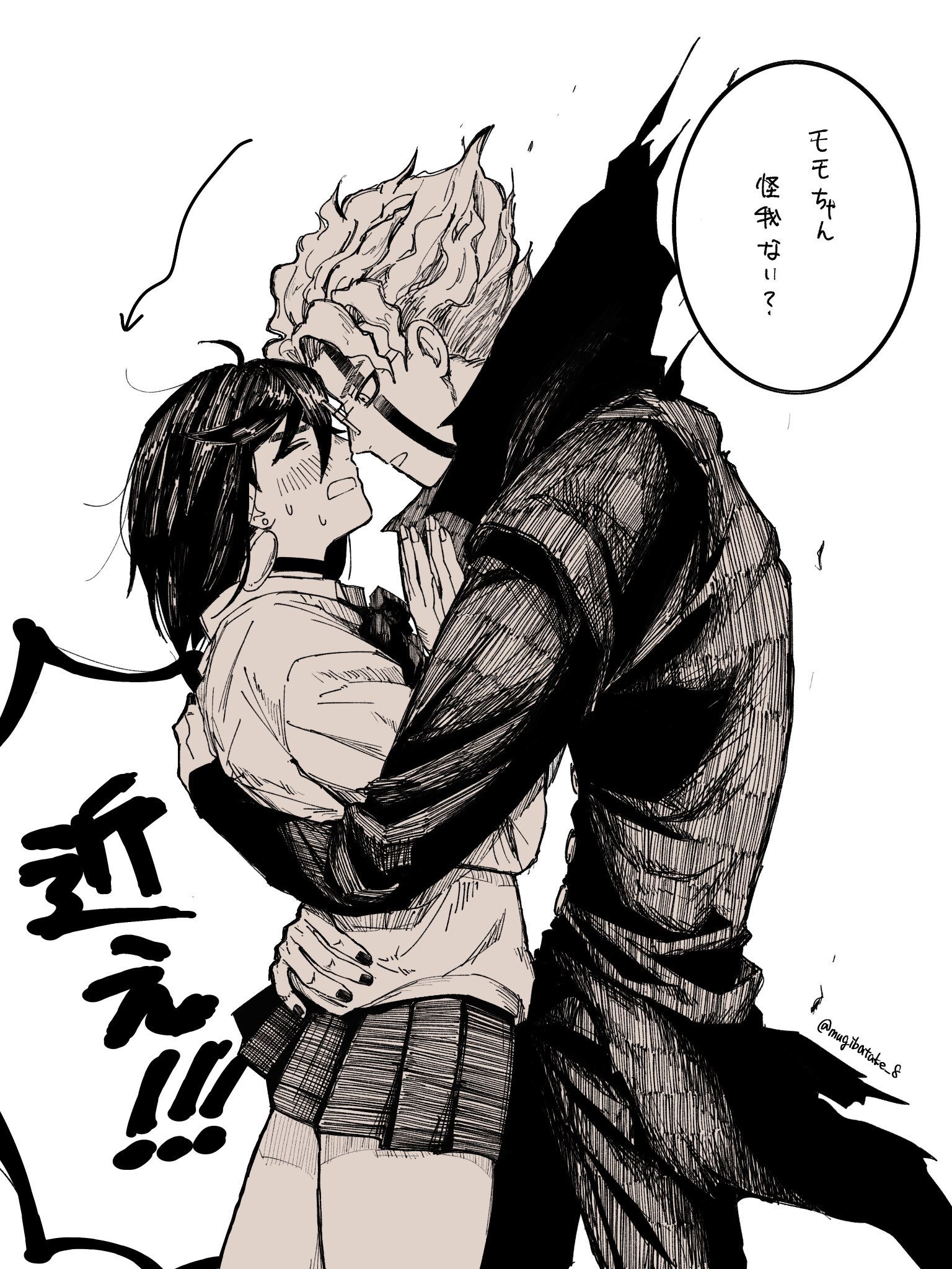 1boy 1girl alternate_form ayase_momo black_choker blush bow bowtie choker commentary cowboy_shot dandadan earrings facial_mark facing_another from_side gakuran glasses greyscale highres hug jewelry long_sleeves looking_at_another loose_bowtie miniskirt monochrome mugibatake open_mouth pleated_skirt profile round_eyewear school_uniform skirt speech_bubble sweatdrop sweater takakura_ken_(dandadan) takakura_ken_(transformed)_(dandadan) transformation translation_request twitter_username white_background