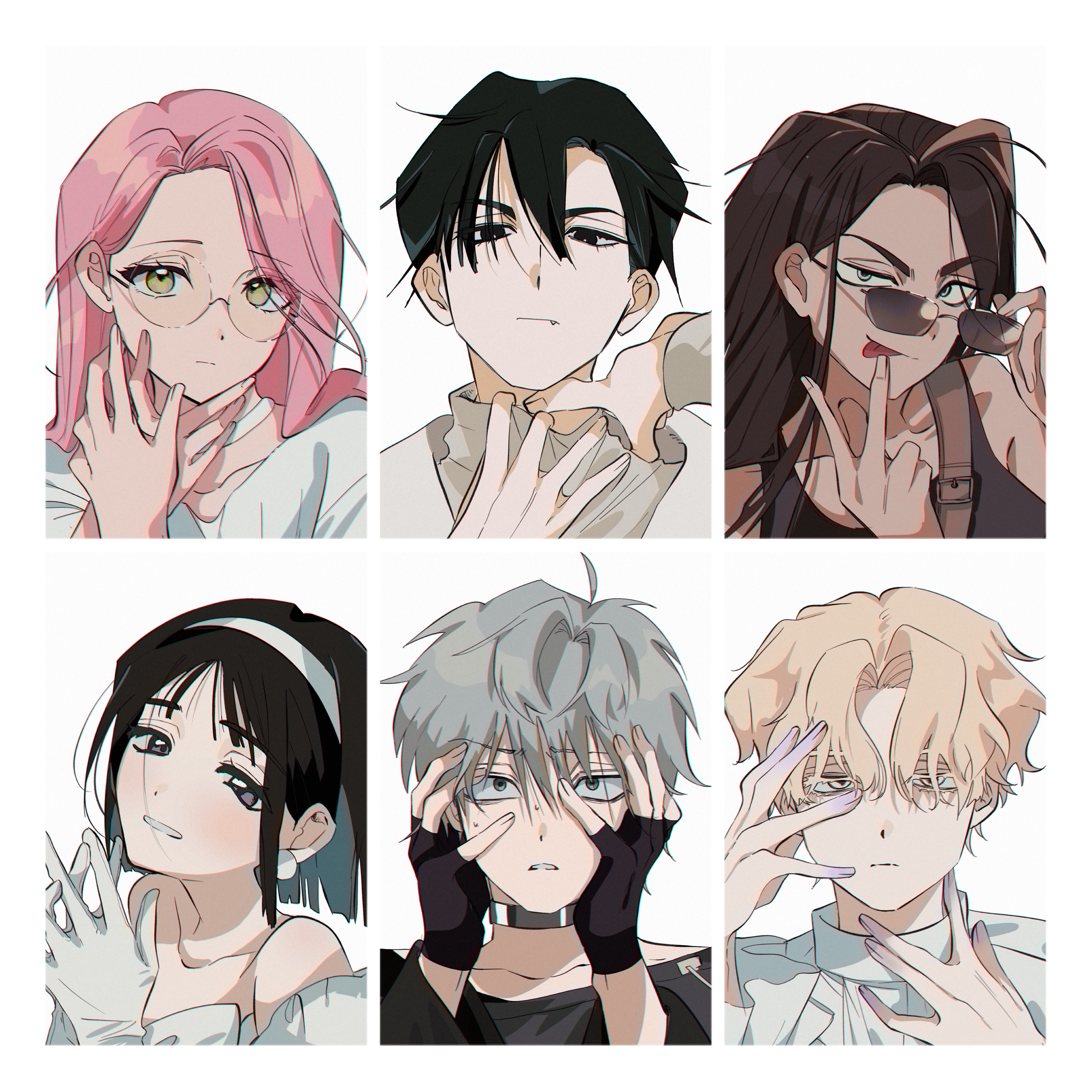 3boys 3girls absurdres adjusting_eyewear alien_stage black_eyes black_gloves black_hair black_shirt black_tank_top blonde_hair bob_cut brown_hair choker colored_extremities column_lineup commentary_request dark-skinned_female dark_skin dress earrings everyone fang fingerless_gloves gloves green_eyes grey_choker grey_eyes grey_hair hairband hand_on_own_face hand_on_own_neck hands_on_own_face hatopippi45 head_tilt highres hyuna_(alien_stage) ivan_(alien_stage) jewelry long_hair looking_at_viewer luka_(alien_stage) male_focus mizi_(alien_stage) multiple_boys multiple_girls off_shoulder pearl_earrings pink_hair portrait purple_eyes rimless_eyewear round_eyewear shirt short_hair simple_background sua_(alien_stage) tank_top till_(alien_stage) tongue tongue_out turtleneck turtleneck_shirt v very_short_hair white_background white_choker white_dress white_gloves white_hairband white_shirt yellow_eyes
