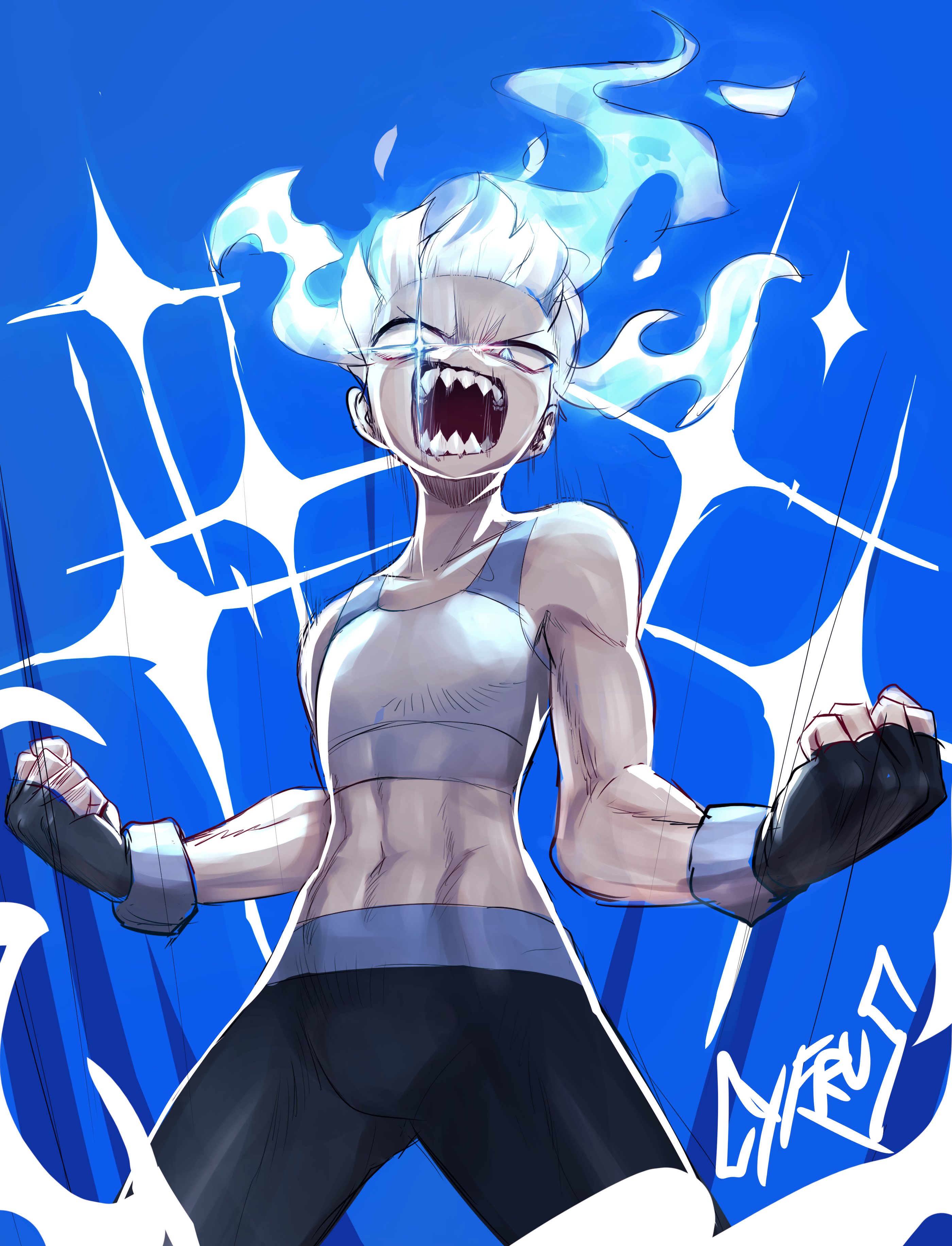 1girl absurdres blue_background clenched_hands commentary cowboy_shot cyfrus english_commentary fiery_hair fingerless_gloves flat_chest gawr_gura gloves glowing glowing_eye highres hololive hololive_english linea_alba navel open_mouth powering_up sharp_teeth signature solo teeth toned toned_female virtual_youtuber white_hair