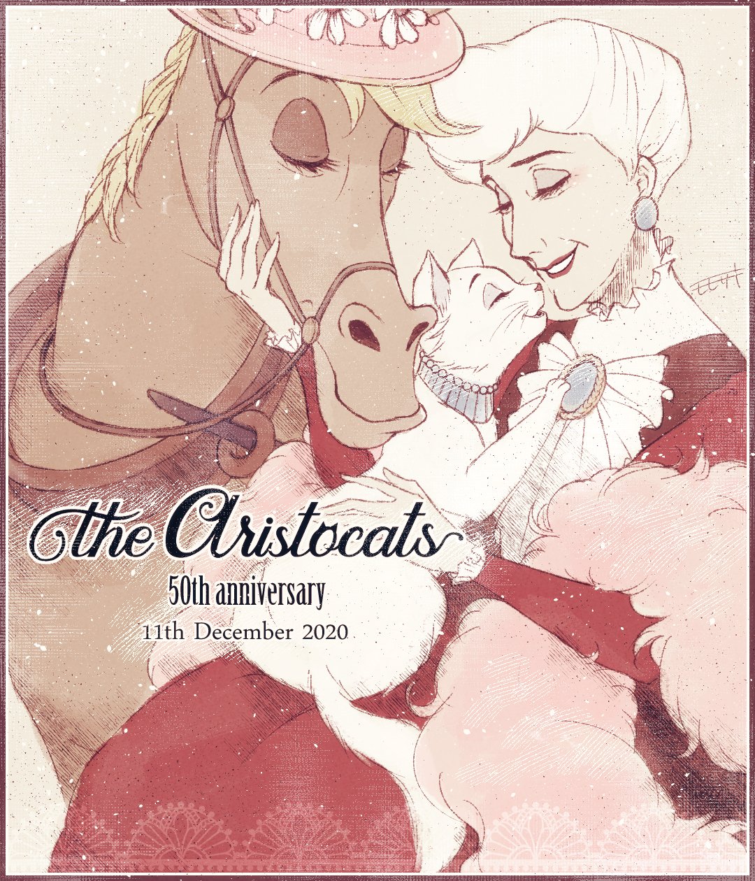 1girl animal anniversary brooch cat copyright_name dated dress duchess_(disney) earrings eyelashes feather_boa frou-frou highres holding holding_animal holding_cat jewelry madame_adelaide_bonfamille momosaki_hiromu old old_woman parted_lips red_dress short_hair the_aristocats white_cat white_hair