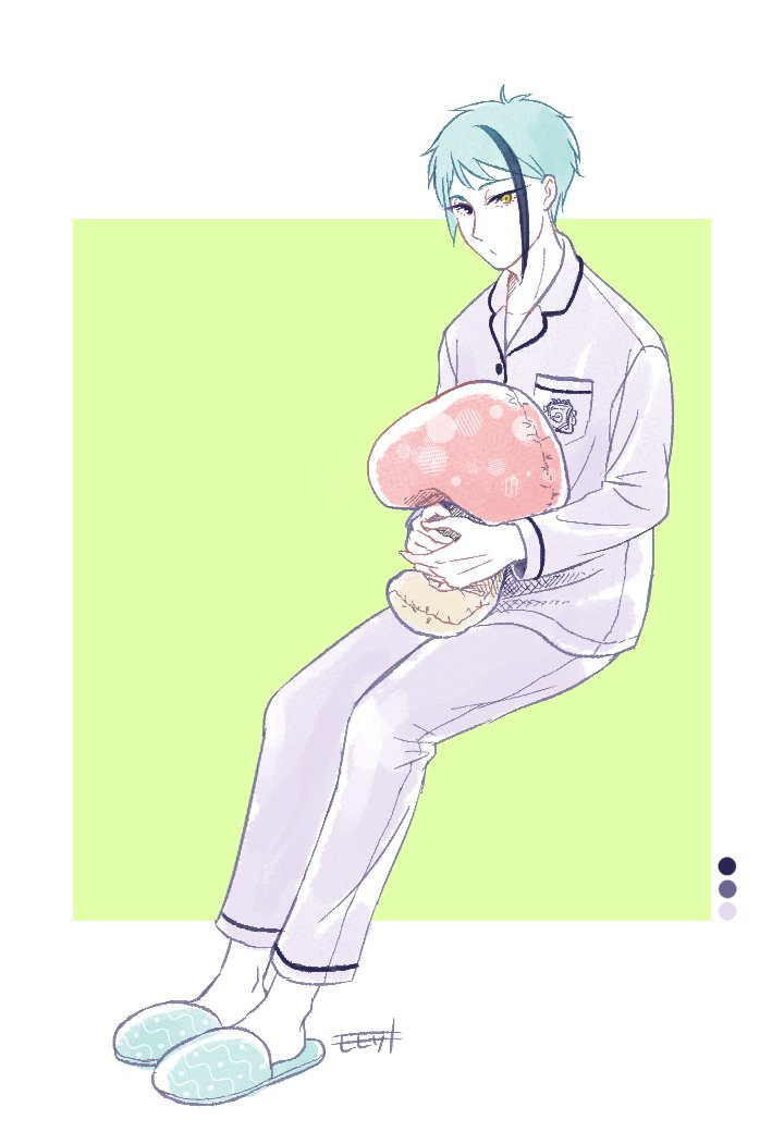 1boy blue_hair blue_slippers full_body green_background holding holding_stuffed_toy invisible_chair jade_leech long_sleeves male_focus momosaki_hiromu multicolored_hair pajamas short_hair sitting slippers streaked_hair stuffed_mushroom stuffed_toy twisted_wonderland