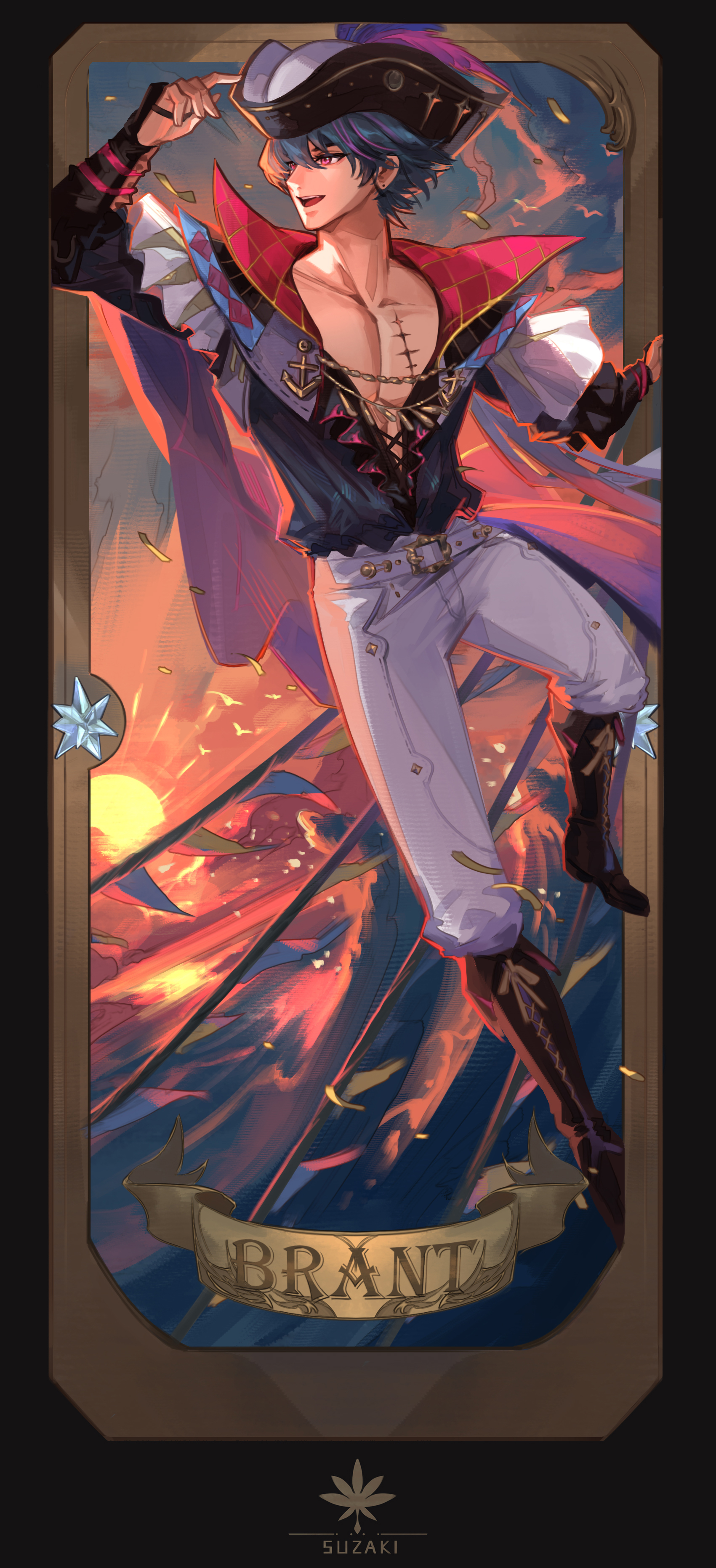 1boy absurdres artist_logo black_boots blue_hair blue_shirt boots brant_(wuthering_waves) card_(medium) character_name collarbone commentary hand_up hat highres knee_boots logo male_focus open_clothes open_shirt pants shirt short_hair smile solo steve_zheng tacet_mark_(wuthering_waves) tricorne white_pants wuthering_waves