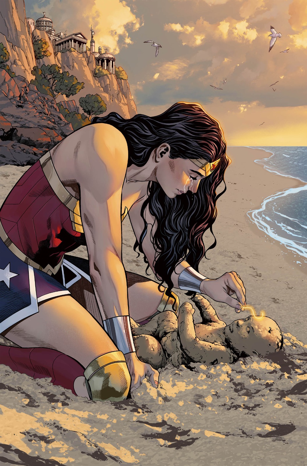 1girl architecture artist_collaboration baby beach bird black_hair boots bracer cloud crying day dc_comics greco-roman_architecture highres kneeling long_hair outdoors sampere_art sand seagull tiara tomeu_morey water wonder_woman wonder_woman_(series)