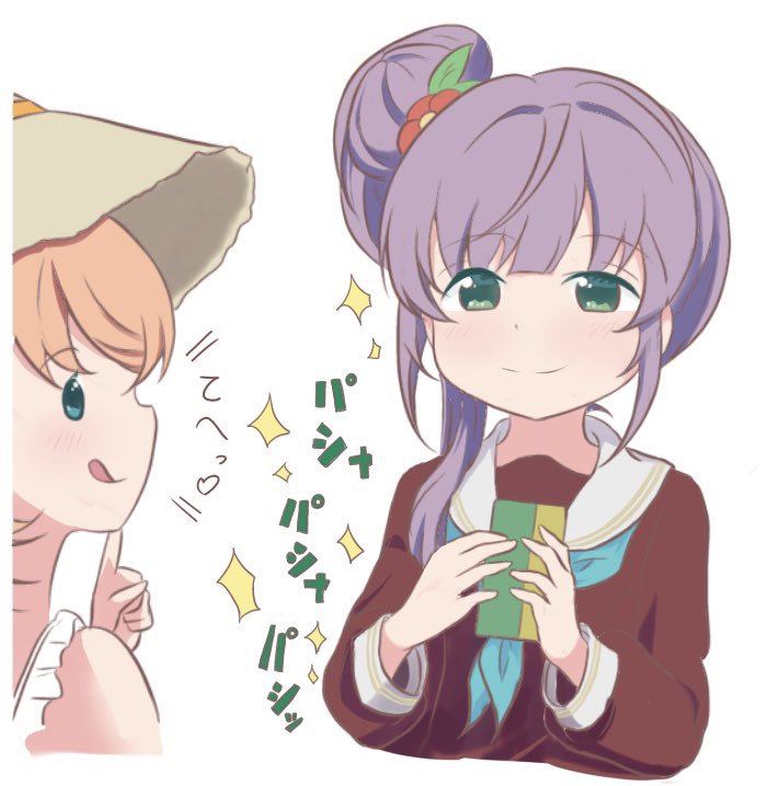 2girls :q aqua_eyes aqua_neckerchief blush brown_dress brown_hat closed_mouth commentary_request crossed_bangs dress flower green_eyes hair_bun hair_flower hair_ornament hasu_no_sora_school_uniform hat hinoshita_kaho holding holding_phone link!_like!_love_live! long_hair long_sleeves looking_at_another love_live! medium_hair multiple_girls neckerchief orange_hair otomune_kozue phone profile purple_hair red_flower ruttsu sailor_collar sailor_dress school_uniform side_ponytail sidelocks sideways_mouth single_side_bun sleeveless sleeveless_dress smile sound_effects sparkle sun_hat taking_picture tongue tongue_out translation_request two_side_up virtual_youtuber white_dress white_sailor_collar winter_uniform