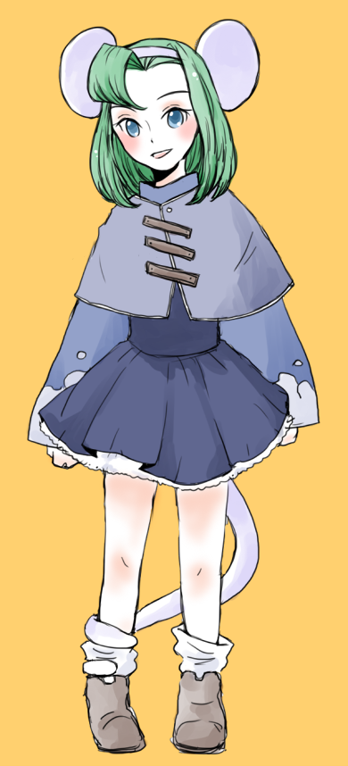 1girl animal_ears brave_fencer_musashiden capelet dress full_body green_hair hairband looking_at_viewer mouse_ears mouse_girl mouse_tail purple_capelet short_hair simple_background skirt smile solo tail topo_(musashiden)