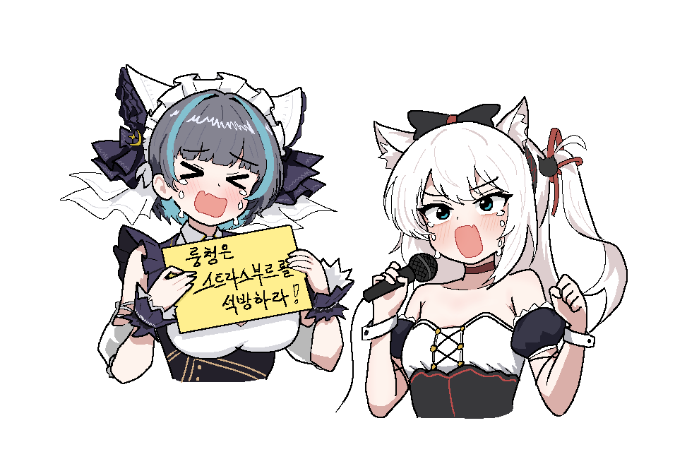 >_< 2girls animal_band animal_ear_fluff animal_ears arm_garter azur_lane black_bow blue_eyes blush bow breasts cat_ears cat_hair_ornament cheshire_(azur_lane) choker cocktiel77 cropped_torso crying crying_with_eyes_open cuff_links detached_sleeves dress fake_animal_ears fang frilled_dress frilled_hairband frilled_ribbon frills hair_bow hair_ornament hairband hammann_(azur_lane) hammann_(retrofit)_(azur_lane) hands_up holding holding_microphone holding_sign korean_commentary large_breasts long_hair long_ribbon maid maid_headdress microphone multicolored_hair multiple_girls one_side_up open_mouth puffy_detached_sleeves puffy_short_sleeves puffy_sleeves purple_hair red_choker red_ribbon ribbon short_sleeves sign simple_background skin_fang small_breasts strapless strapless_dress streaked_hair tears trait_connection translation_request two-tone_hair upper_body white_background white_dress white_hair white_ribbon wrist_cuffs