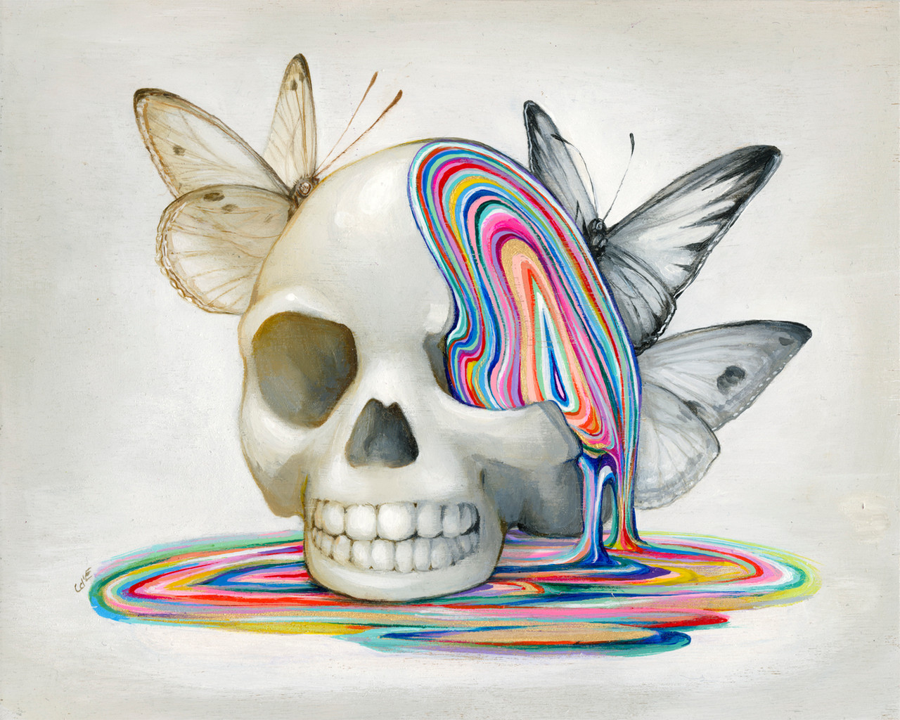 bug butterfly camilla_d'errico colorful dia_de_muertos dripping insect melting no_humans original painting_(medium) skull surreal teeth traditional_media