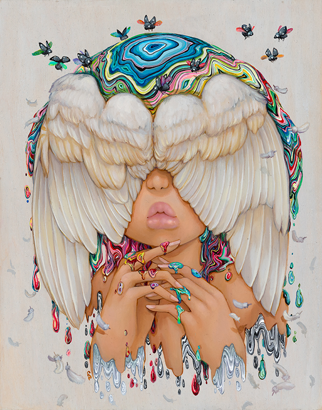 1girl bug camilla_d'errico colorful covered_eyes dark-skinned_female dark_skin dripping feathered_wings feathers fingernails head_wings insect ladybug liquid_hair mask melting oil_painting_(medium) original painting_(medium) pink_lips solo thick_lips traditional_media wings