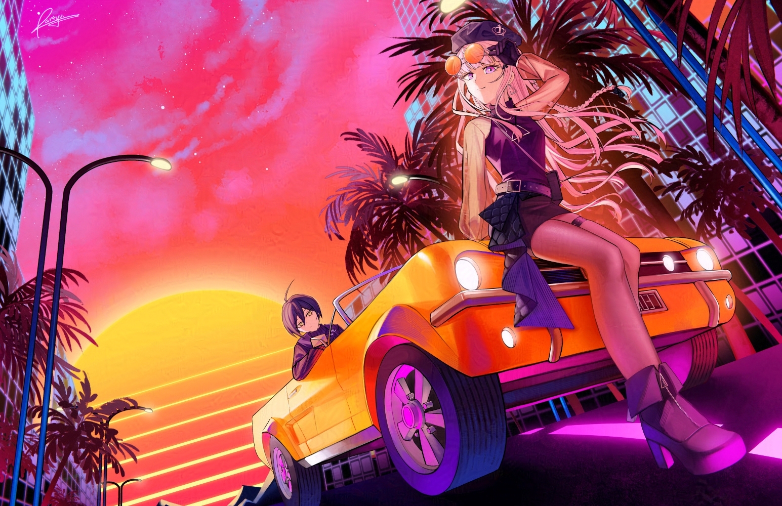 1boy 1girl adjusting_eyewear ahoge ankle_boots arm_up belt beret black_gloves black_hair black_jacket black_skirt boots braid breasts brown_pantyhose car commentary danganronpa:_trigger_happy_havoc danganronpa_(series) danganronpa_v3:_killing_harmony evening eyelashes gloves hair_between_eyes hat jacket jewelry kirigiri_kyoko lamppost leaning_against_vehicle long_hair long_sleeves looking_at_viewer motor_vehicle outdoors palm_tree pantyhose partyu pencil_skirt pink_sky purple_eyes purple_hair round_eyewear saihara_shuichi see-through_clothes see-through_sleeves short_hair side_braid signature sitting skirt sky smile star_(sky) starry_sky sun sunglasses thigh_strap tree very_long_hair yellow_eyes