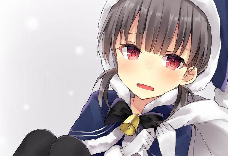 1girl bell black_pants blue_capelet blue_hat blunt_bangs capelet close-up commentary_request fur-trimmed_headwear fur-trimmed_sleeves fur_trim furrowed_brow girlfriend_(kari) gloves grey_background grey_hair hat holding holding_sack knees_up light_blush long_sleeves looking_at_viewer maruru_(marurupan) medium_hair neck_bell open_mouth pants pom_pom_(clothes) raised_inner_eyebrows red_eyes sack santa_hat shigino_mutsumi snowing solo tareme white_gloves