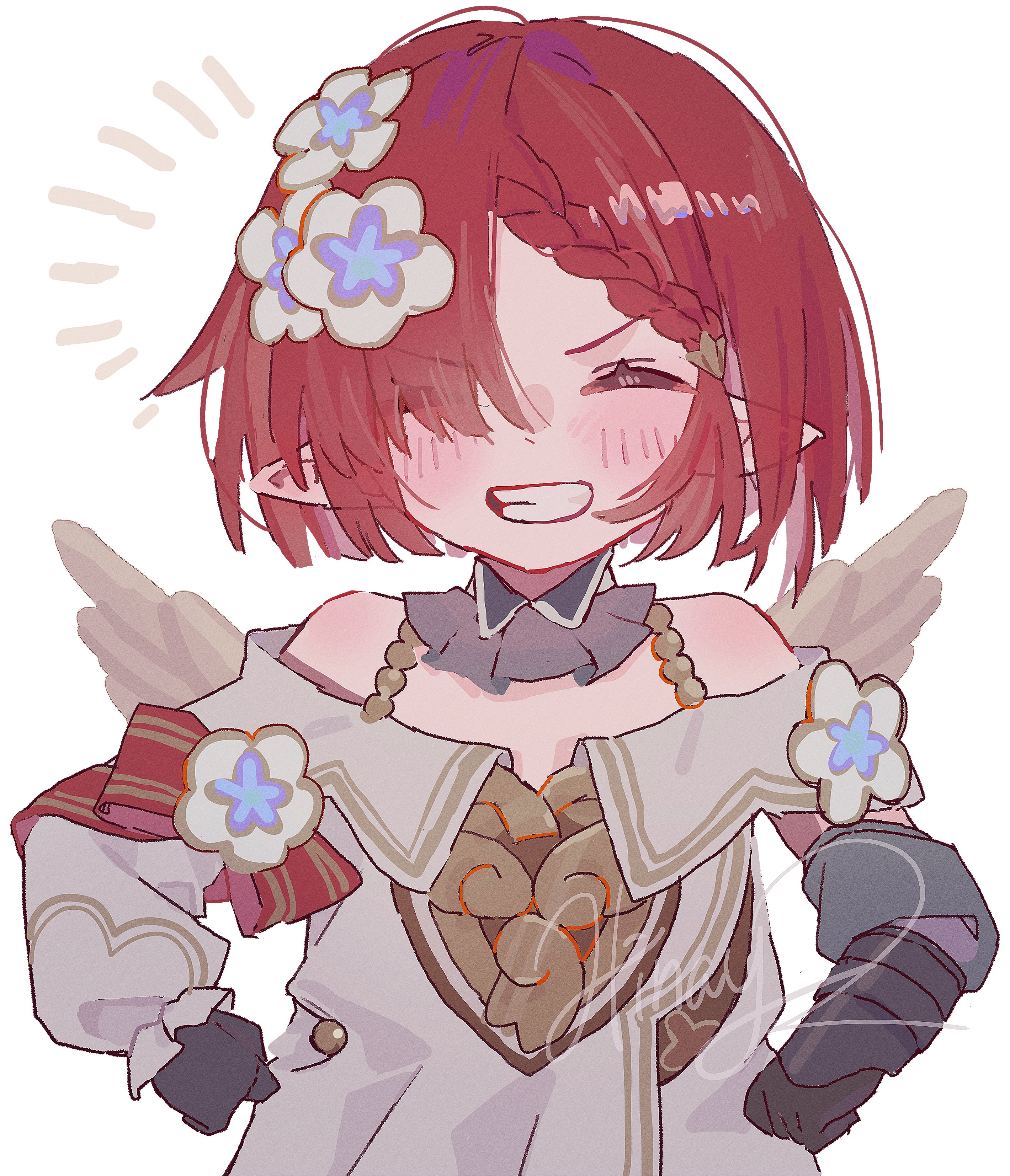 1girl absurdres ancient_greek_clothes angel_wings bare_shoulders black_gloves commentary dress eyes_visible_through_hair gloves greco-roman_clothes hair_over_one_eye head_wreath highres hinay_2 honkai:_star_rail honkai_(series) open_mouth pointy_ears red_hair short_hair simple_background smile solo untranslatable_commentary trianne_(honkai:_star_rail) upper_body white_background white_dress wings