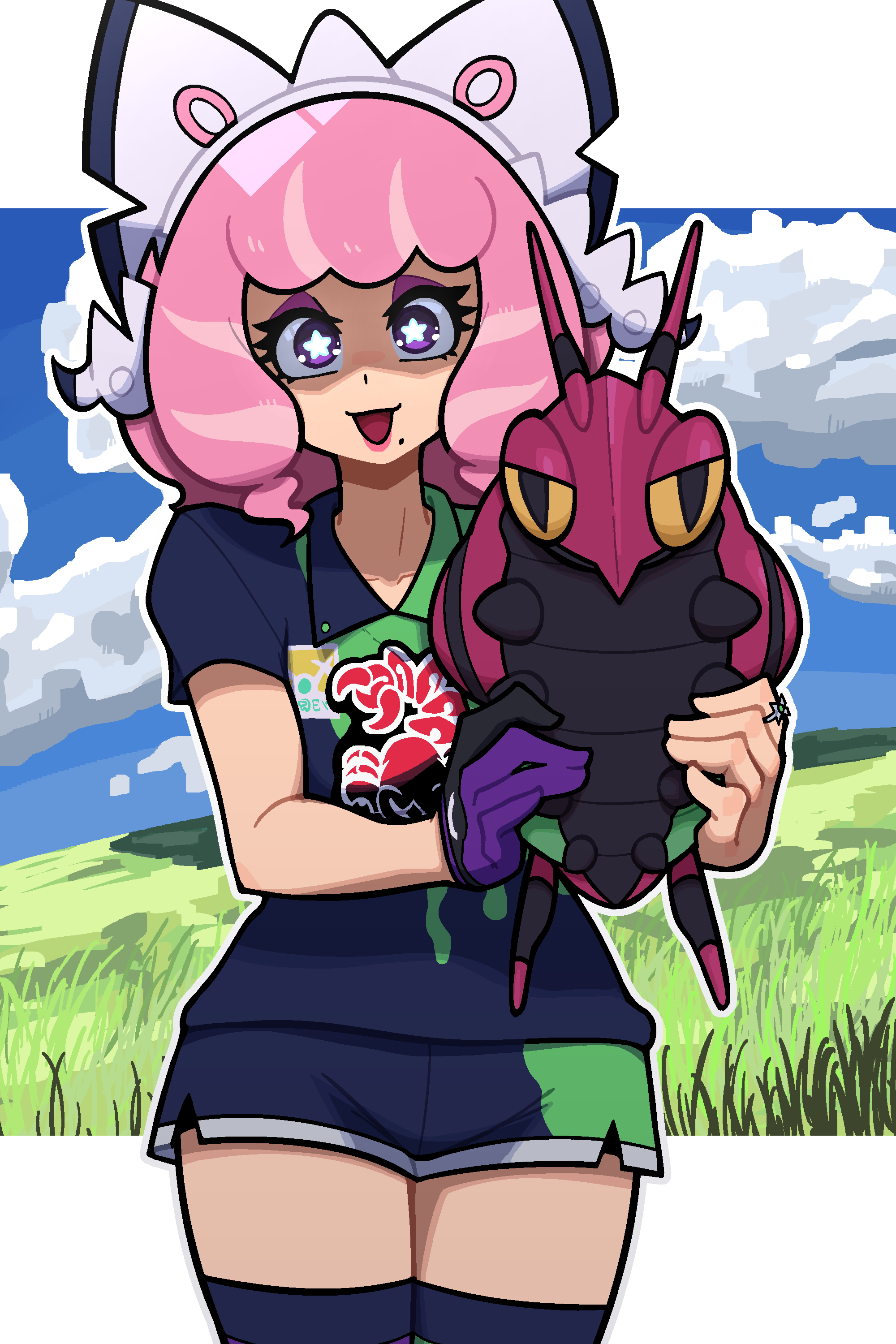 1girl :d absurdres bow_hairband cloud collared_shirt commentary day eyeshadow gen_5_pokemon grass hairband happy highres holding holding_pokemon jewelry klara_(pokemon) looking_at_viewer makeup medium_hair mole mole_under_mouth muds nintendo no_jacket open_mouth outdoors pink_hair pokemon pokemon_(creature) pokemon_swsh purple_eyeshadow ring shirt shorts sky smile star-shaped_pupils star_(symbol) symbol-shaped_pupils thighhighs venipede white_hairband